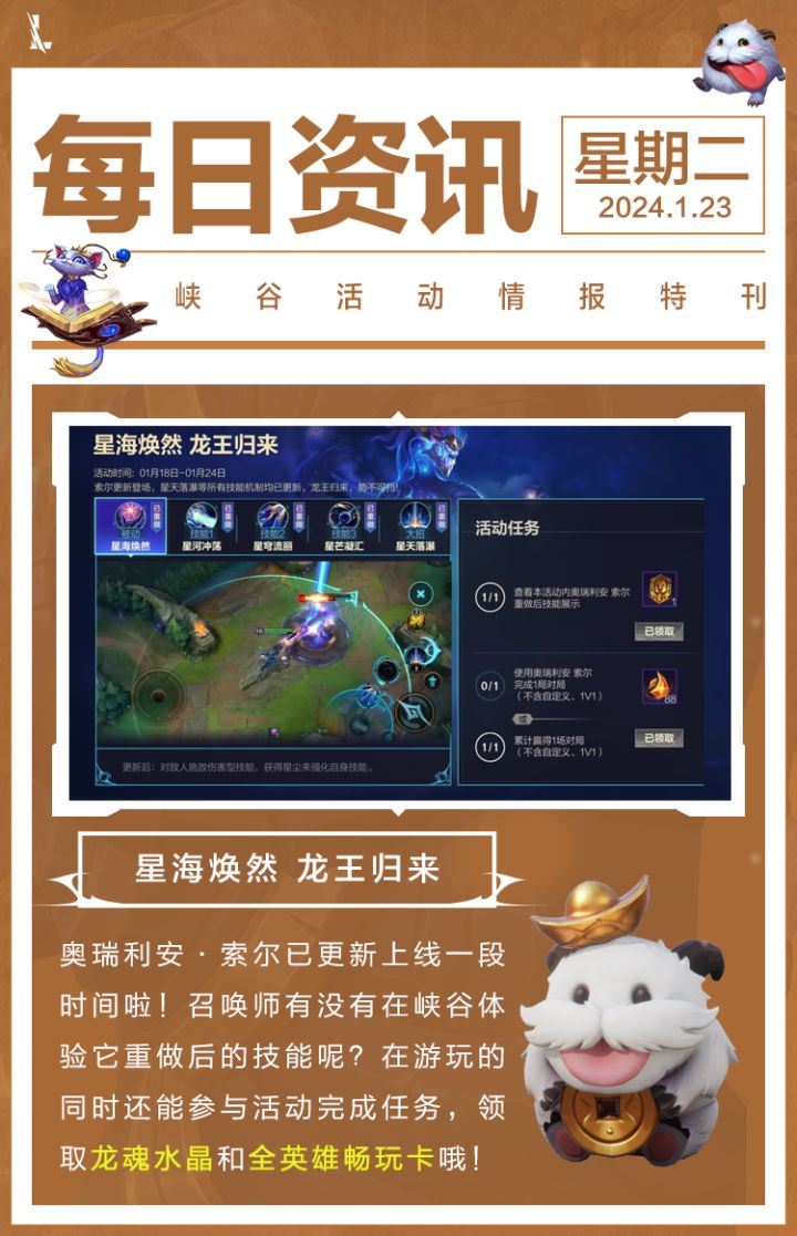 亲爱的召唤师:为了带给大家更好的游戏体验,我们将于1月25日9:00—12:00进行不停机更新。请您选择合适的网络环境进行更新。以下是具体更新内容,请查阅:更新时间:1月25日上午9:00-12:00英雄调整铸星龙王 奥瑞利安·索尔奥瑞利安·索尔在前期有些过于乏力,因此我们加强了他的前期伤害和机动性,并降低了他前期的法力值消耗。Q(1)技能:星河冲荡●每0.5秒法力值消耗:10/14