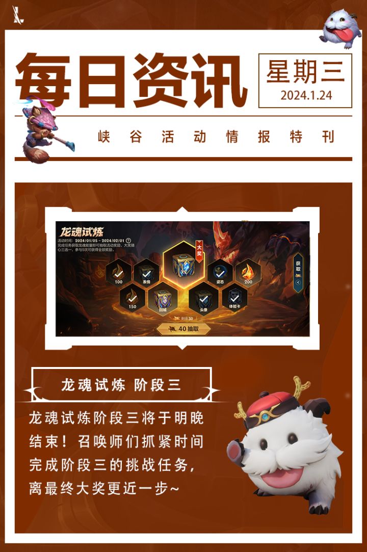 🐲→→→齐德“龙”咚锵,好运叮当响!📢是什么让隆哥「龙」光焕发、「龙」行大运、好运接「龙」?原来是龙腾华彩系列皮肤的英雄们给大家拜个早年啦!还有咱们可爱的守护灵也来给大家带来了新年好运。召唤师快来动动小手指☝左右滑动,将🔸精美壁纸🔸抢先换上迎接龙年的到来吧!📢龙年的好运还有春晖众神们相伴!更多高清版壁纸已上传,想要获取的召唤师,可前往公众号后台私信回复🔎关键词-【2024年2月壁纸】即可获得~