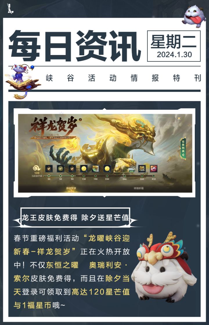 龙王皮肤、史诗皮肤随机魄罗宝箱、橙色原石、魄罗能量……你是不是已经被应接不暇的新春福利包围得有点晕头转向了?隆哥已将福利长图准备好,快快查看下方图片,将新春福利活动信息全部查收!