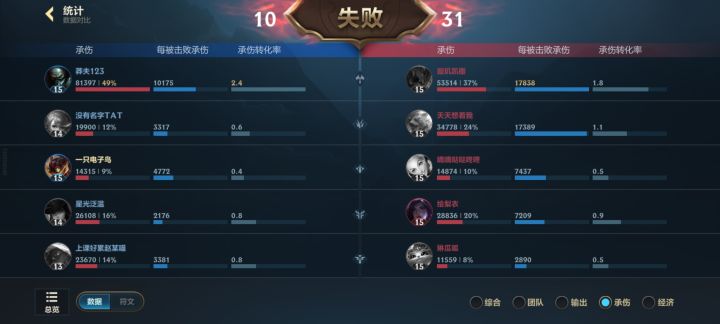 话不多说看数据,总不能因为螃蟹死七次刷承伤,就说他有贡献吧?承伤全是线上承伤,参团20%,就这样把我的努力全部异化掉了