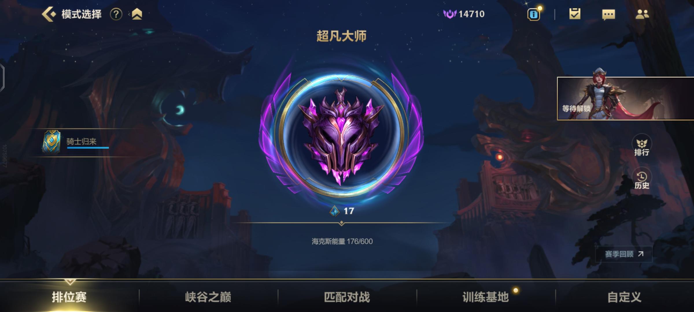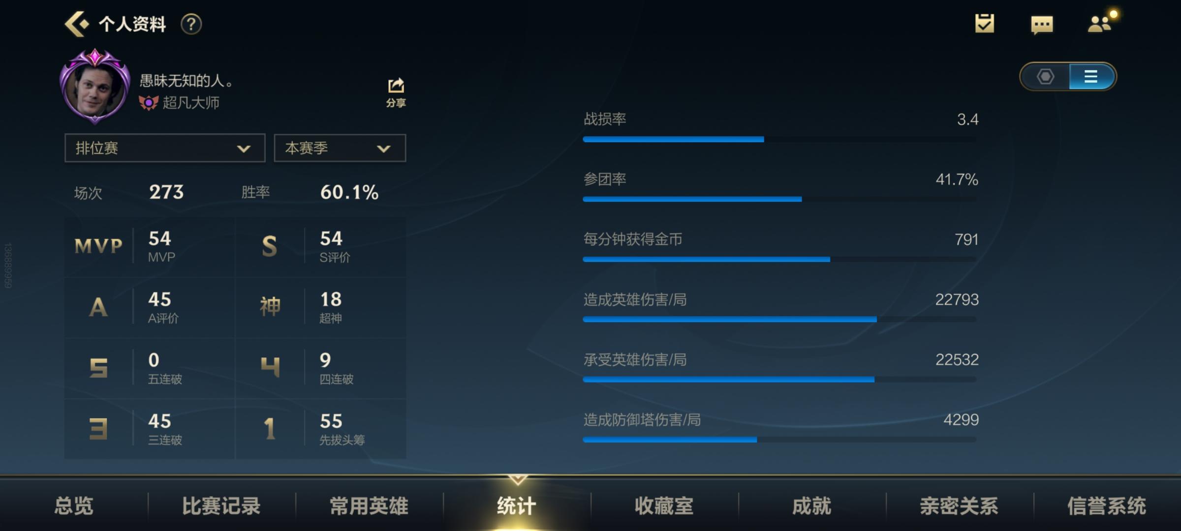 ID 愚昧无知的人。 微信区,270场60的胜率,大师段位,来个能c的兄弟一起上王者
