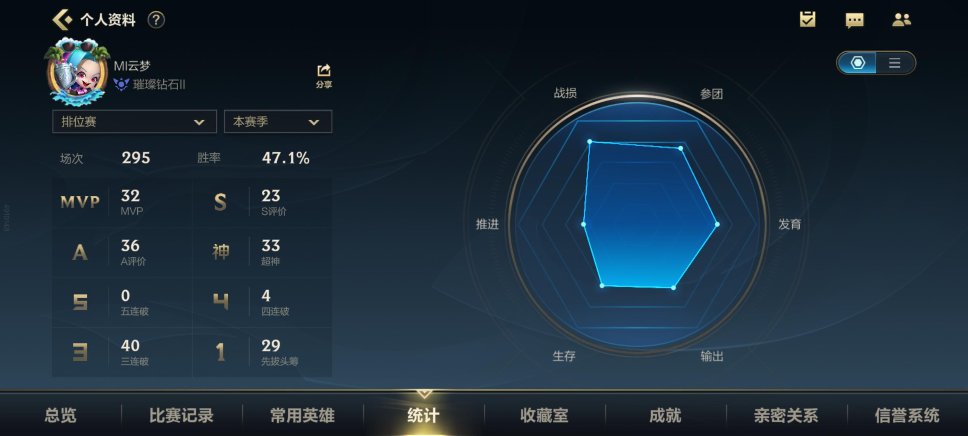 找个妹妹一起玩,野王,主玩寡妇,雪人,龙女的胜率接近百分之七十,其他打野玩的不太好只有60多,QQ2690133549可查战绩,上赛季钻石四,佛系上分人