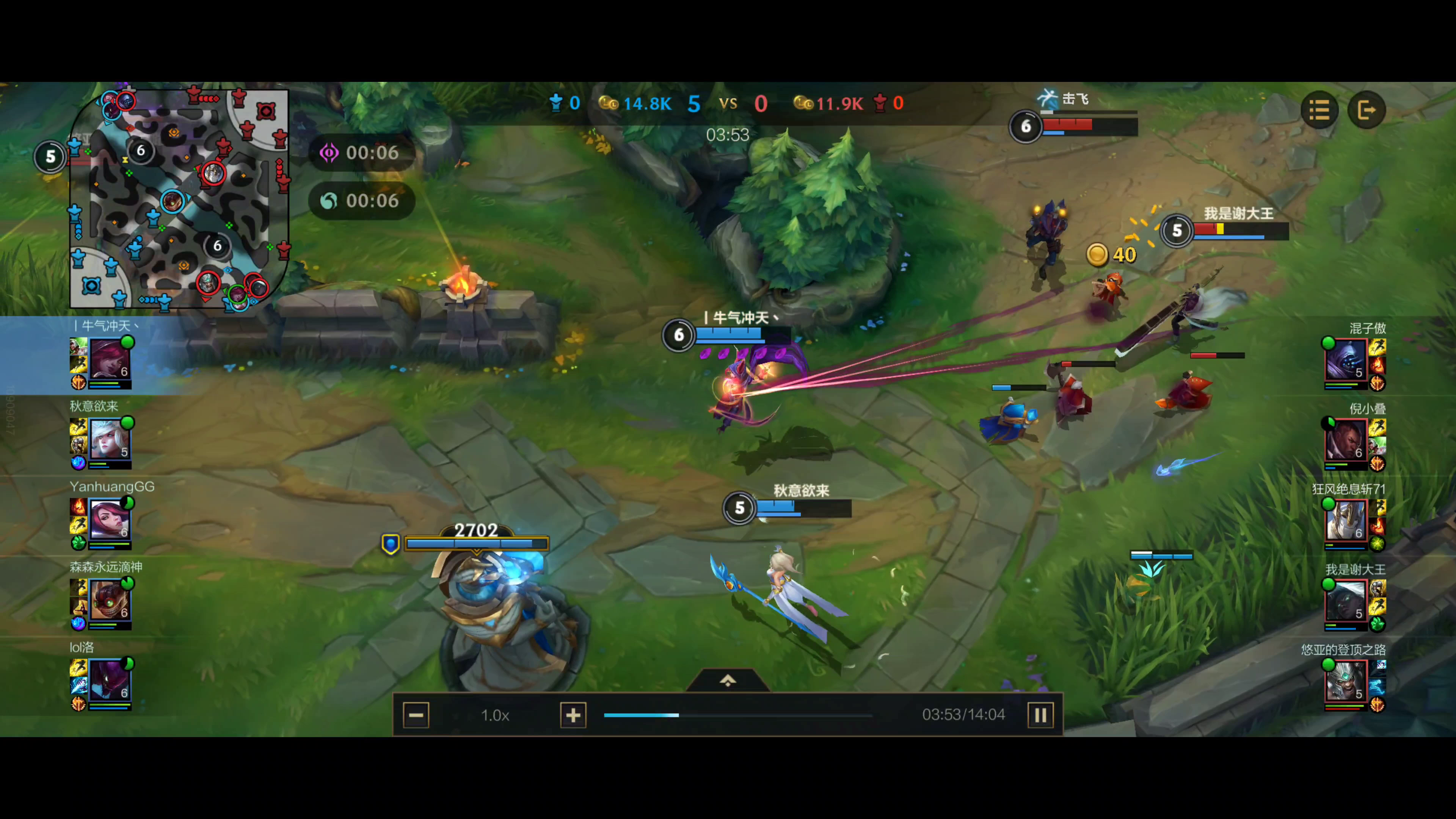 霞的大招可以躲避敌人伤害,这把提前预判对面赛娜大招,对面打野蛮王来gank,一心想杀我方风女,线上硬刚卢锡安和赛娜,攻击利用一技能和普攻将羽毛置于身后,三点一线3技能倒钩拿下三杀。