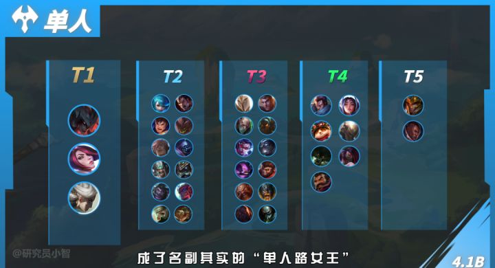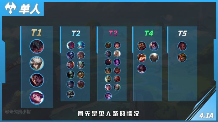 最近隆哥在终极魔典过完瘾之后,又回到了排位上分的路上,随着4.1a版本的上线,各分路上的英雄强度又有一些小变化,今天隆哥带来作者:研究员小智对于新版本上分利器的解析,一起来看看能不能汲取上分灵感呢!单人路英雄推荐在单人路上,卡蜜尔依旧凭借着超高的胜率和不错的BAN率牢牢坐在T1的位置上,卡蜜尔灵活的机动性与Q(1)技能的真实伤害,让卡蜜尔在当前“坦克联盟”的环境下如鱼得水,能配合打野快速带起节