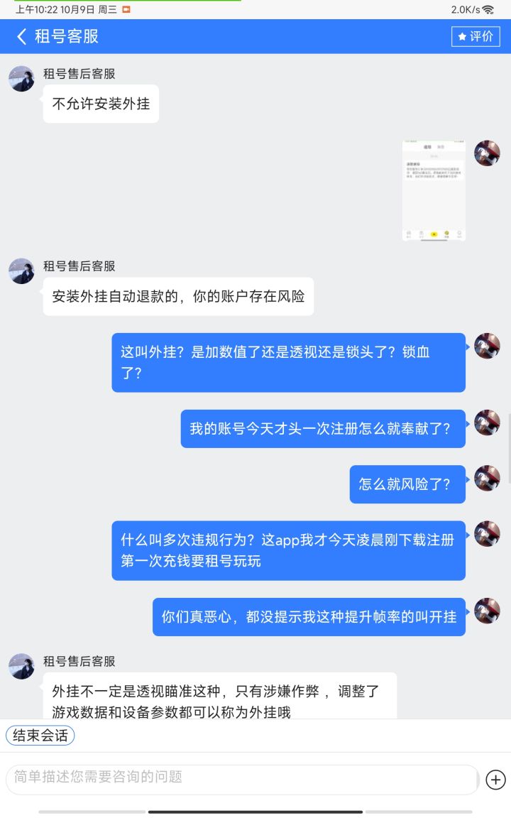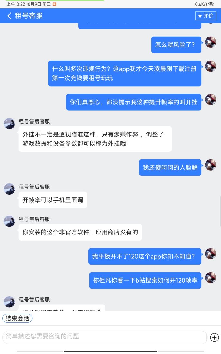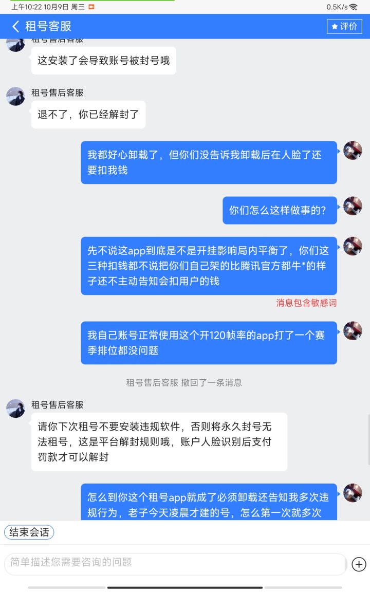 我第一次租英雄联盟手游的号因为之前有用英雄联盟手游一键锁帧(开120帧率的)然后被这租号王得找了,硬说我由于您以存在多次违规行为所以封了我的号,真挺抽象的,咱说他们做事真恶心,一直找我的问题,什么有提示会扣钱我没看到,是啊,我点了黄色的申请解除然后下一步也点了黄色按钮直接就扫人脸了,你们好啊觉得好像上个画面告诉我会扣钱似的老理直气壮说,要么号永封给我退钱要么钱没号这样,总之就是他很抱歉系统不人性化