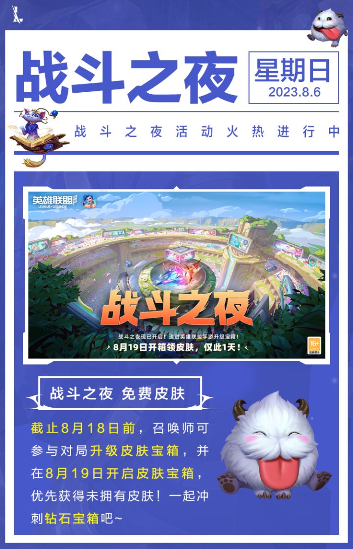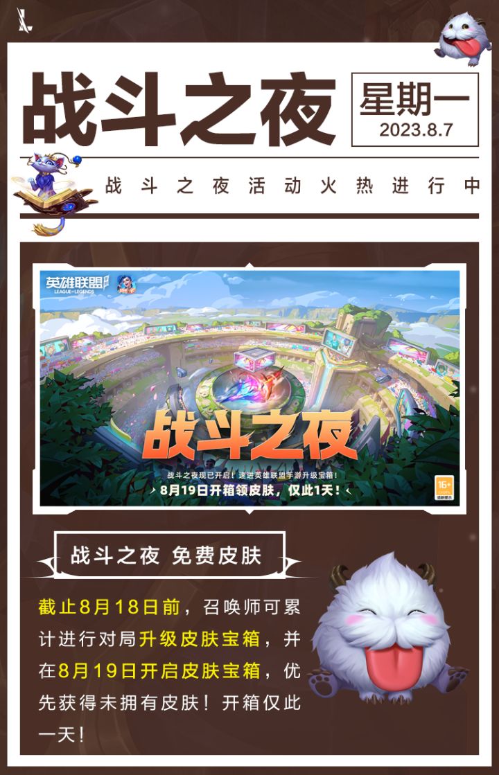 游戏内现有的送皮肤活动虽然即将结束,但免费的皮肤奖励永远不嫌多!在4.3a版本更新后,游戏内将再次开启送皮肤活动,而这次活动是老召唤师们都非常熟悉的战斗之夜!快来看看活动详情吧~战斗之夜 免费皮肤战斗之夜活动将于8月4日11:00逐步开启。其中8月4日至8月18日,召唤师可通过参与游戏对局,为皮肤宝箱升级。最高可将宝箱升级至钻石宝箱。宝箱升级所需的对局数如下:宝箱等级所需对局数白银宝箱8黄金宝
