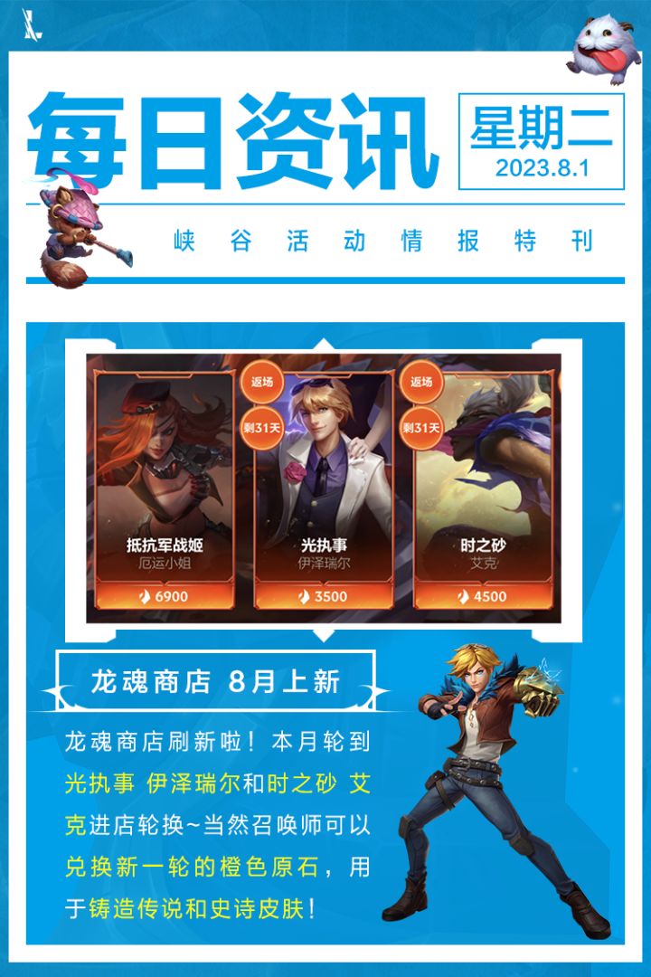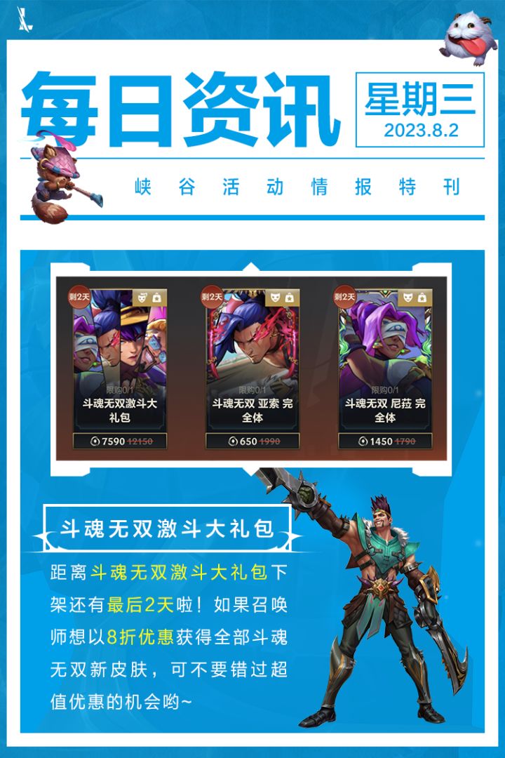 ↓游戏福利锦囊↓(具体活动以游戏内实际为准)活动:一周年福利派对时间:截止至7月30日奖励:小蜜蜂 提莫,史诗皮肤随机魄罗宝箱,英雄自选礼包*3,龙魂水晶*500,限时语音礼盒活动:斗魂无双 累充好礼时间:截止至7月30日奖励:水晶秘钥,魄罗能量,斗魂无双降临限时魄罗宝箱活动:灵魂决斗 限时开启时间:截止至7月31日奖励:龙魂水晶,周一幸运宝箱活动:斗魂无双 超燃竞技时间:
