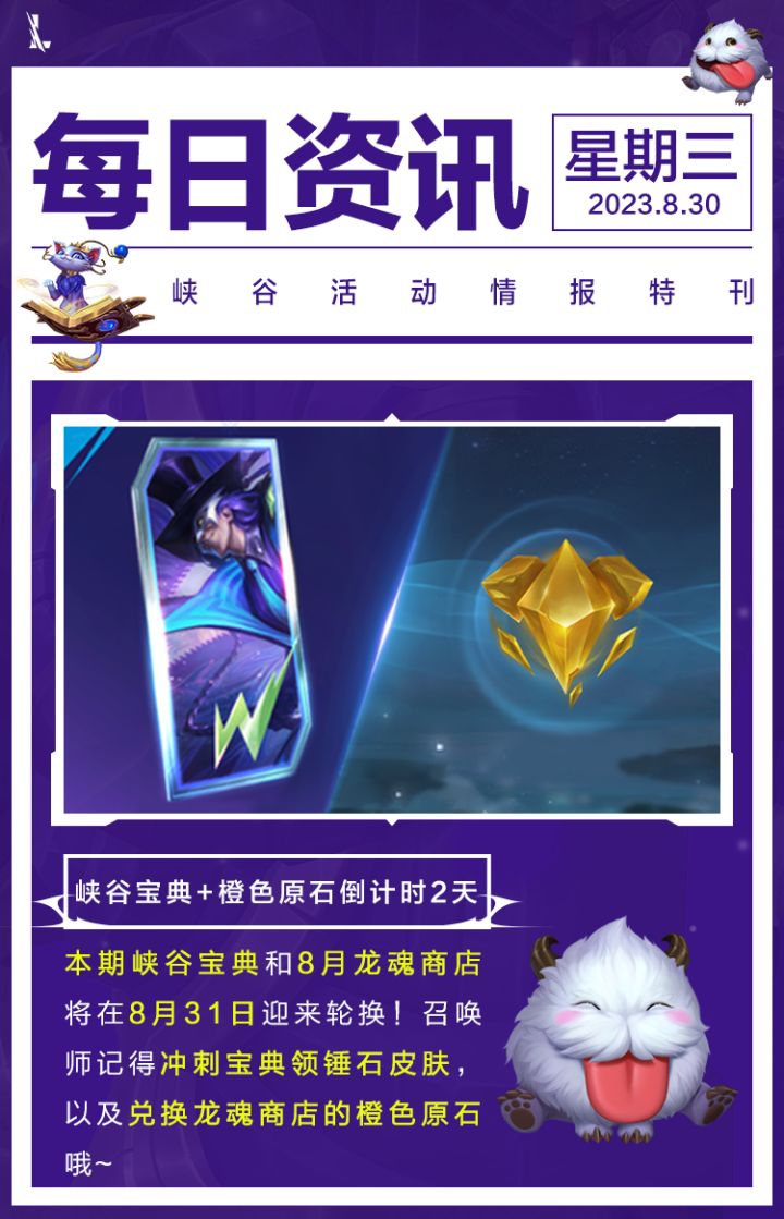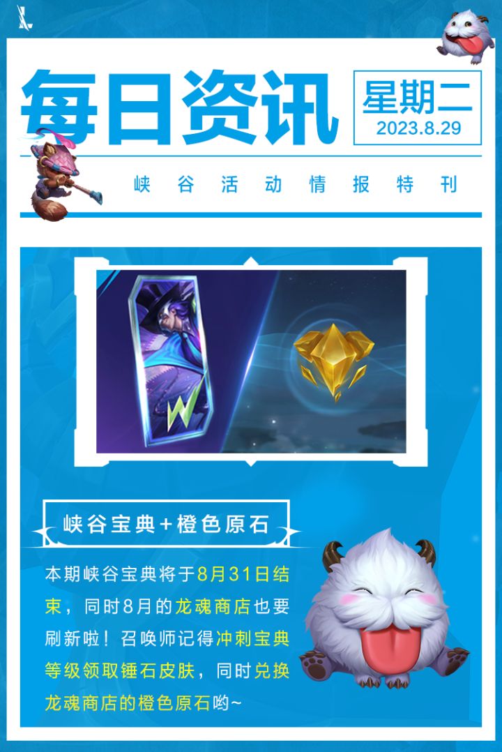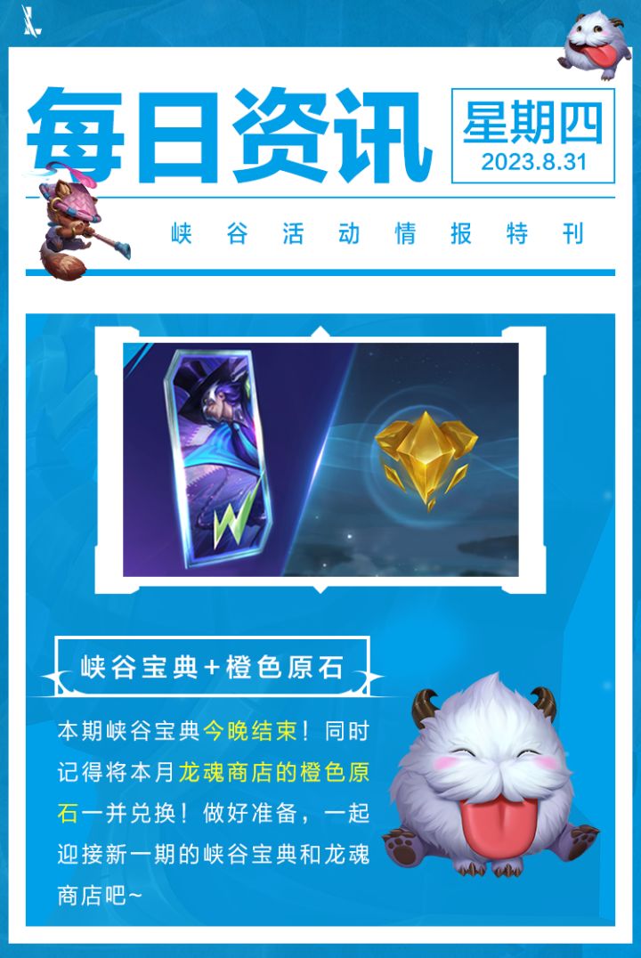 亲爱的召唤师们:我们注意到在本期"盗梦暗影 锤石"峡谷宝典活动中,部分召唤师在升级宝典等级时遇到了一些困扰。我们一直致力于为大家提供好的游戏体验,因此提供一些福利助力大家最后一周宝典冲刺。全体召唤师宝典福利如下:峡谷宝典等级*6+星纹券*60宝典福利将通过邮箱发放,请召唤师们在8月28日18:00:00-8月31日23:59:59期间登录并查收邮件。希望这个小小的福利能够表达对您支持的感激