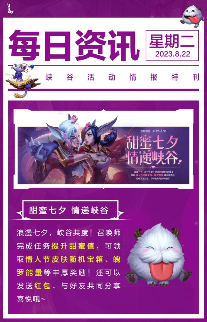 有人夜里看海,有人甜蜜双排,有人在等待娱乐模式中盼了又盼。这不,新一轮的夏日娱乐轮换计划来了!克隆大作战模式将于8月25日0:00~8月28日23:59限时回归!召唤师又可以用五位一样的英雄并肩作战啦~与此同时,峡谷的粉红浪漫持续传递中!情人节皮肤随机宝箱、魄罗能量、甄选皮肤幸运抵扣券等众多惊喜等待着大家,快来峡谷一起体验吧~甜蜜七夕 情递峡谷甜蜜值已在峡谷中传递!今日起,截止至8月31日,