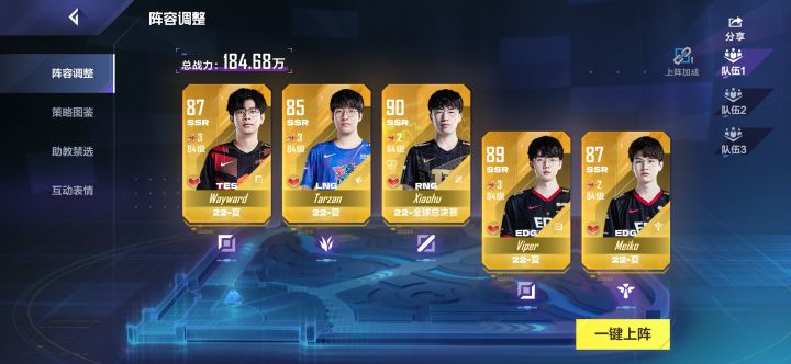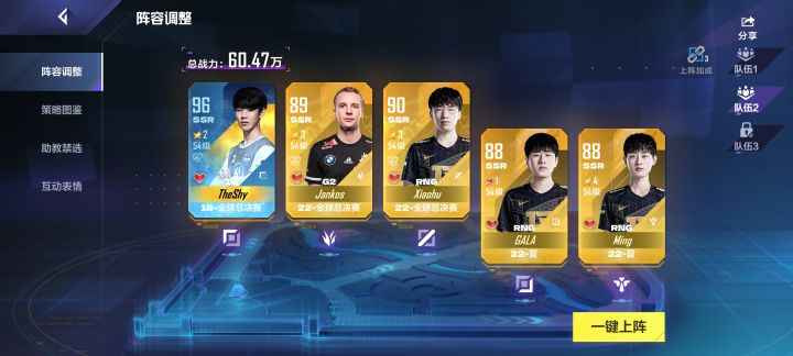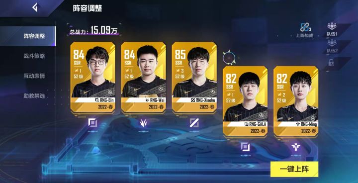 RNG全员阵容,这一阵容搭配在一起不仅可以获取永不言弃的羁绊加成作用,还可以激活三个金色的上阵羁绊加成,其中还有双人组合可以达成各种羁绊