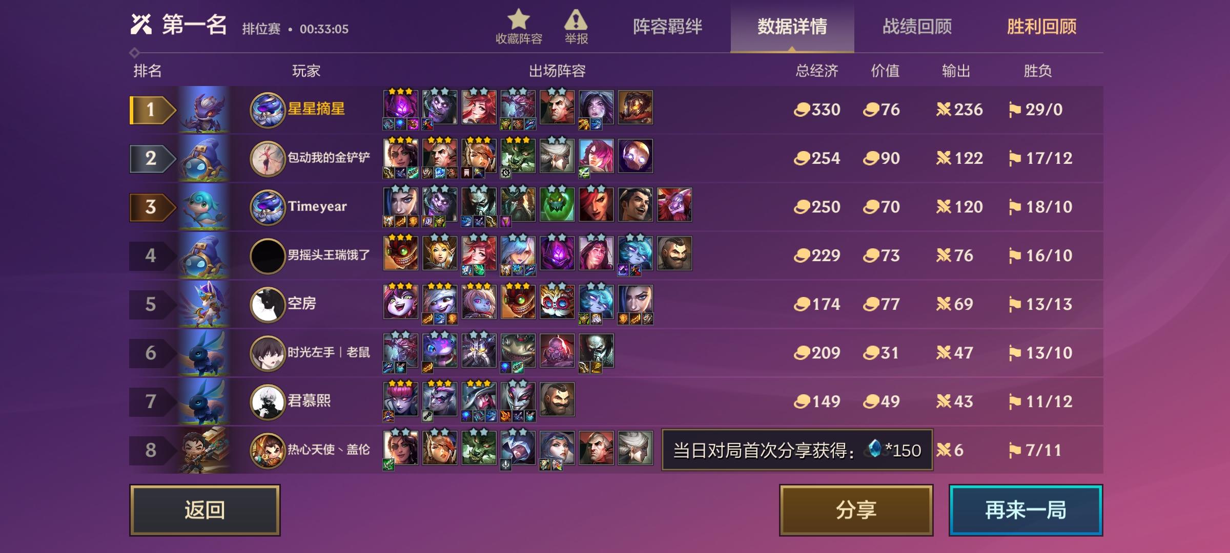 Hello,大家好,我是兔子,今天继续为大家补充一套T0阵容,5变异大虫子,这套阵容虽然有点偏娱乐一些但是如果变异随机的好,依旧是T0的存在,这个赛季不知道大家有没有发现,T0阵容和T1阵容是都可以上分的,这也是这个赛季好玩的地方,胡了玩什么都是有进决赛圈的可能的,兔子也是对这个版本的理解的高度更上一层楼了,把眼光放宽一些,上分阵容其实是有很多的!话不多说,先附上战绩!对局中一共玩了5盘大虫子,