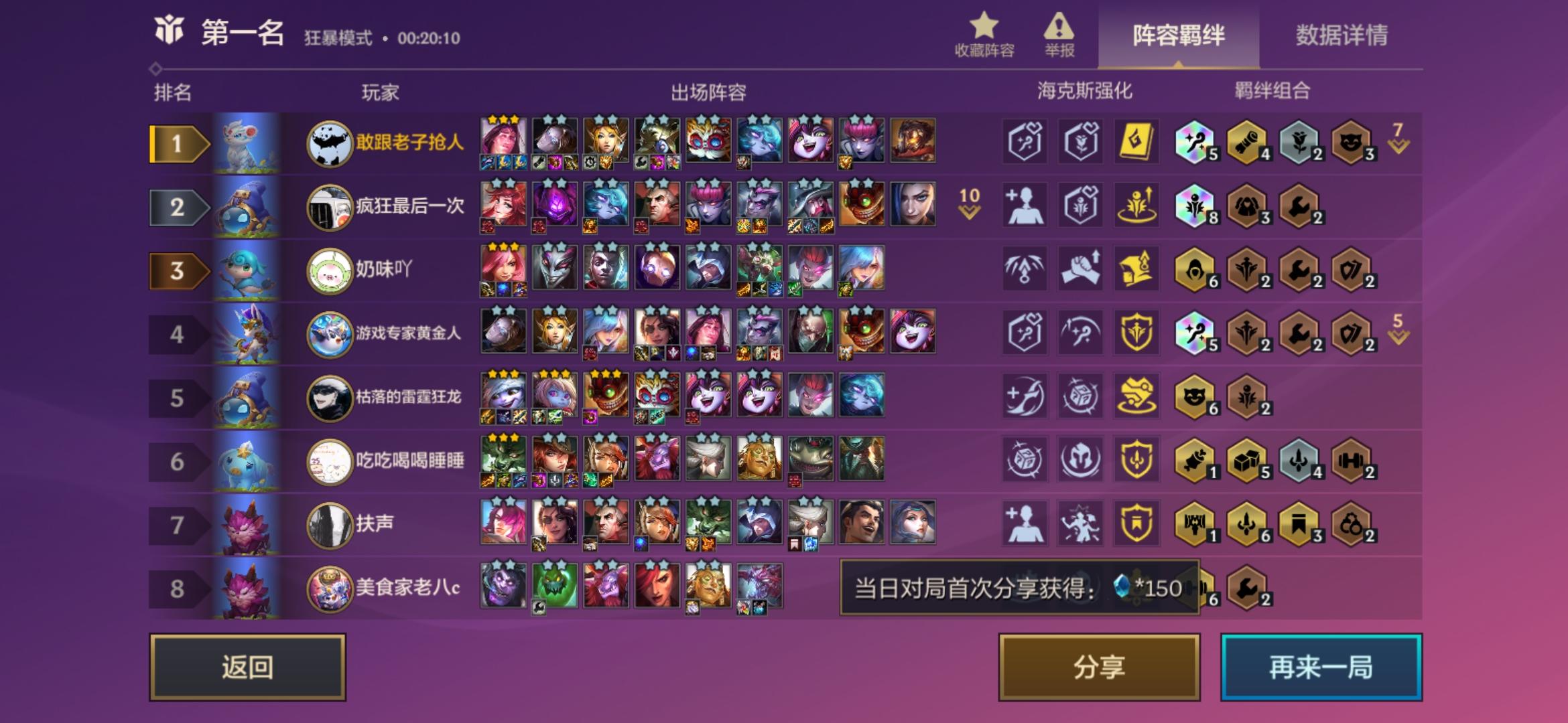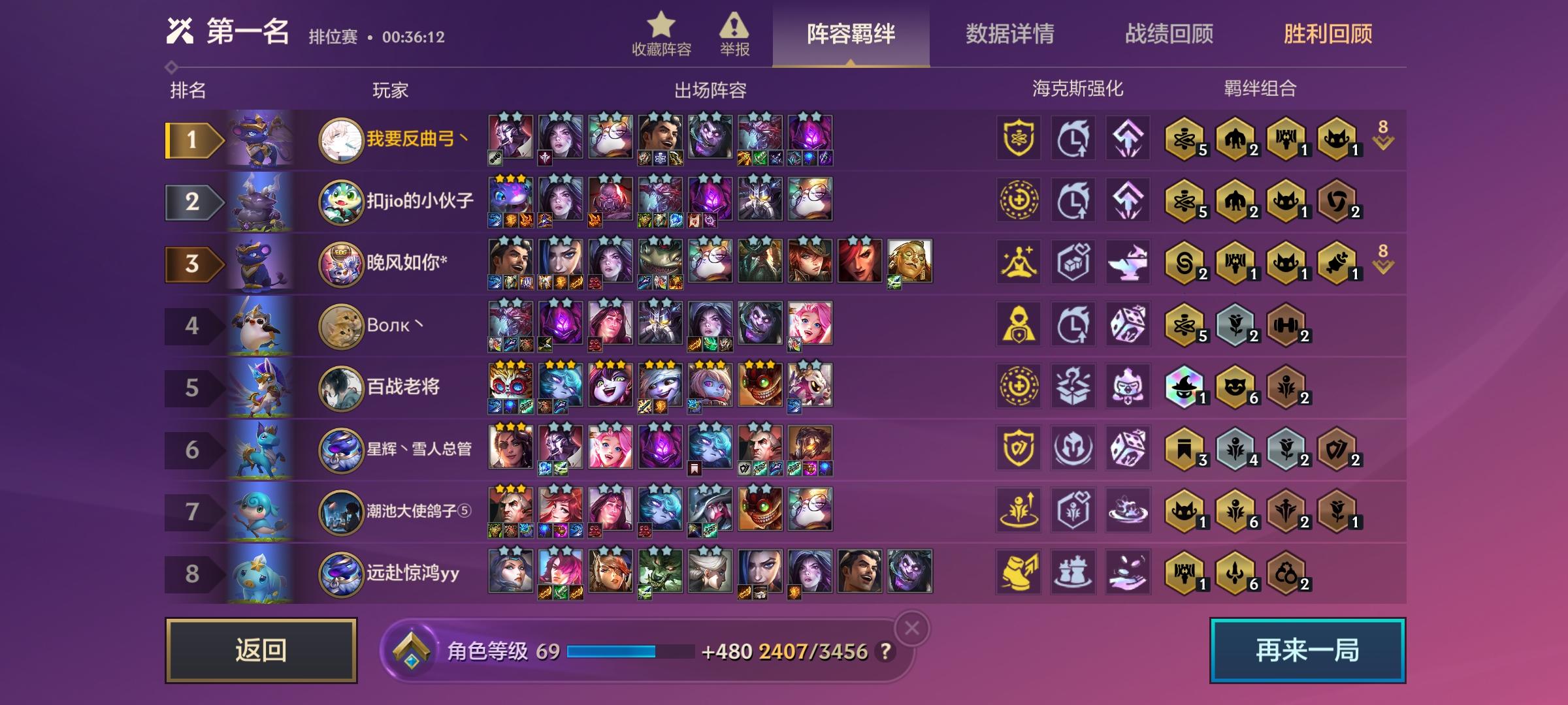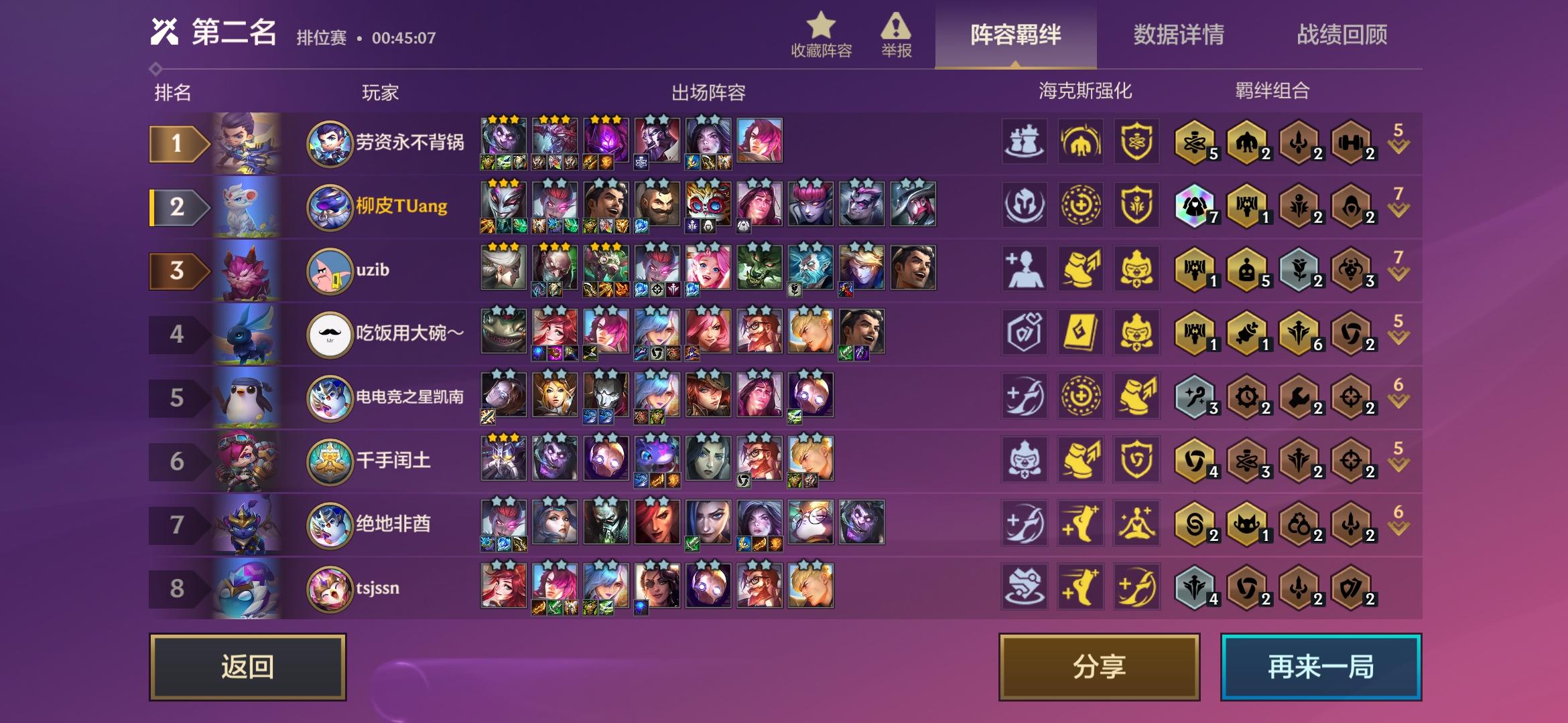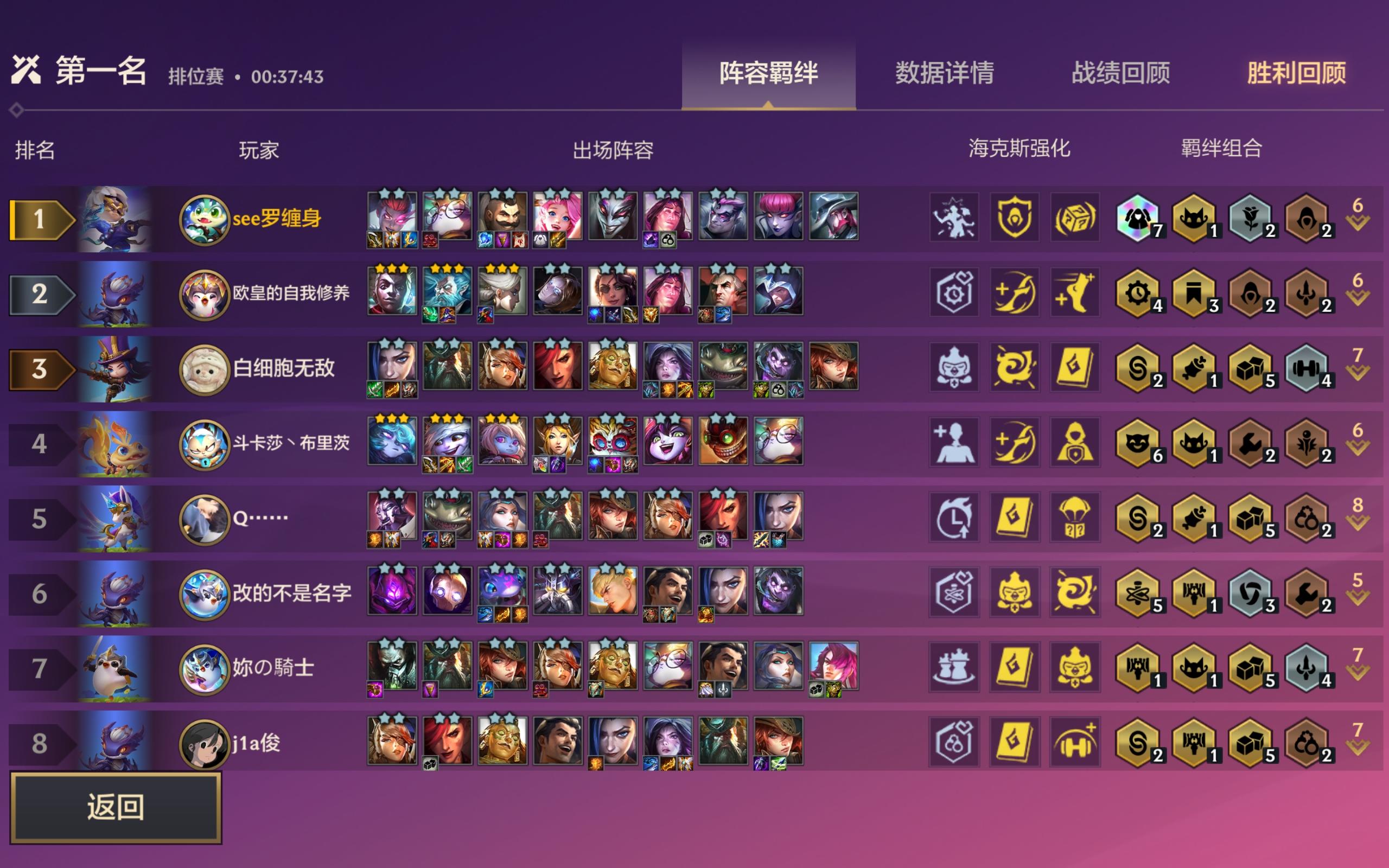 这把差点老八出门,4阶段选秀找到一个铲子,但是一直想等着合辛迪加纹章,可甲一直不来,最后就七滴血了,第三个海克斯拿到打捞筒,后面的野怪是给的静止法衣,直接随便从商店拿个人给他卖掉,分解成了甲和拳,合出纹章,七辛迪加,一直锁到选秀,剩我和第二,有个阿卡丽,正好二星,鸡来!🙉