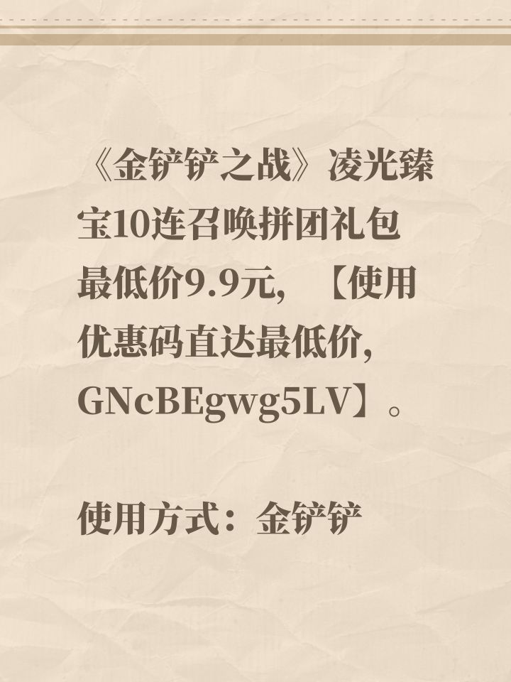 《金铲铲之战》凌光臻宝10连召唤拼团礼包最低价9.9元,【使用优惠码直达最低价,GNcBEgwg5LV】。使用方式:金铲铲之战—超值—拼团福利—使用优惠码。