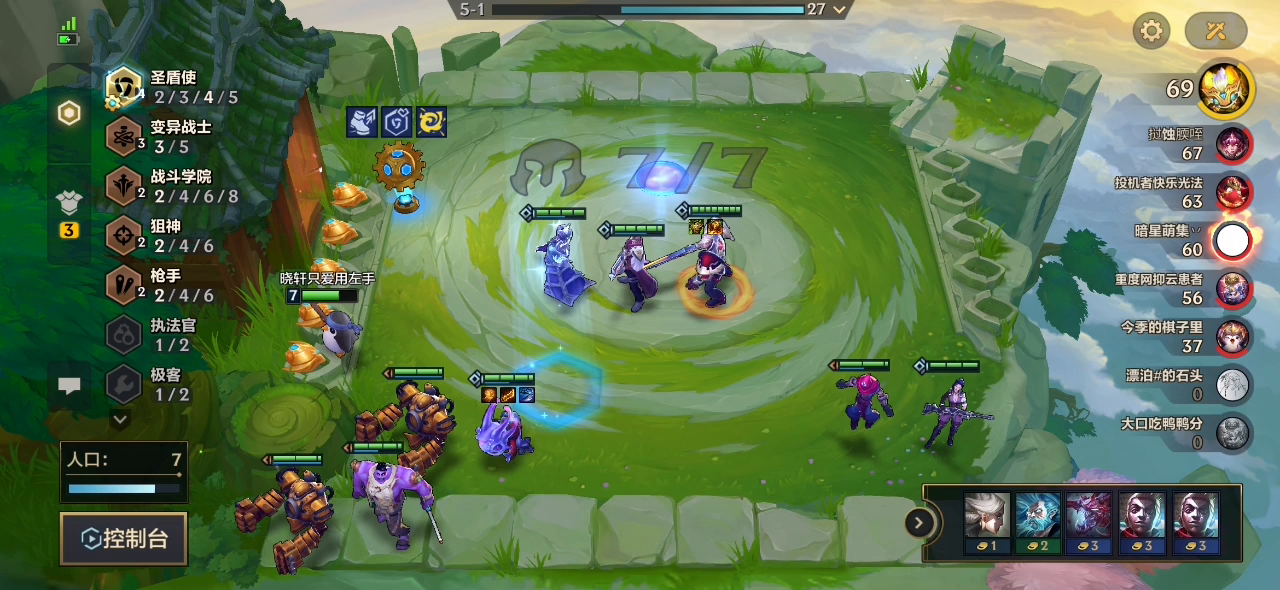 这是今天上午打的一局白金1到钻4晋级赛 给大家分享一下 高手绕路 开局海克斯不理想选了羽量级选手 想着这局赌圣盾吧吃个烂分 结果一看场上8家加上我有6家变异圣盾大嘴 有着4圣盾的加持 硬着头皮度过了前期直到5阶段 这么多人赌大嘴我看d到3级不太现实 于是我也没有冲动d牌就稳稳吃点利息 这时候有一家还真给他d出三星大嘴了 我看这局势我得转阵容了 不转烂分怕是都没得吃了 到5-1阶段向发牌员白嫖了一张金克丝 我还在犹豫 最后一刻还是把大嘴下了换上金克丝 但是没春哥 选秀抢了个泰坦 转成型就是3炼金2格斗2枪手这么一个阵容 7阶段大成型加里奥2星金克丝2星加猫咪完全压场感觉这局有了 场上一家8挑战卡莎和一家圣盾大嘴 8挑战压力比较大因为他血量比较健康 果然最后就剩我两家背水一战