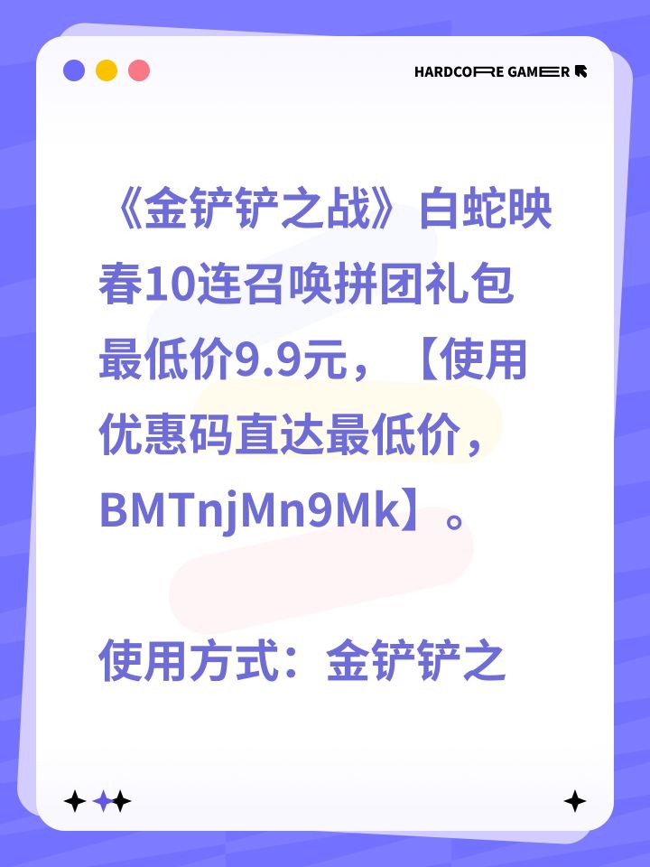 《金铲铲之战》灵蛇甘霖10连召唤拼团礼包最低价9.9元,【使用优惠码直达最低价,UdmhHdUdNx】。使用方式:金铲铲之战—超值—拼团福利—使用优惠码。