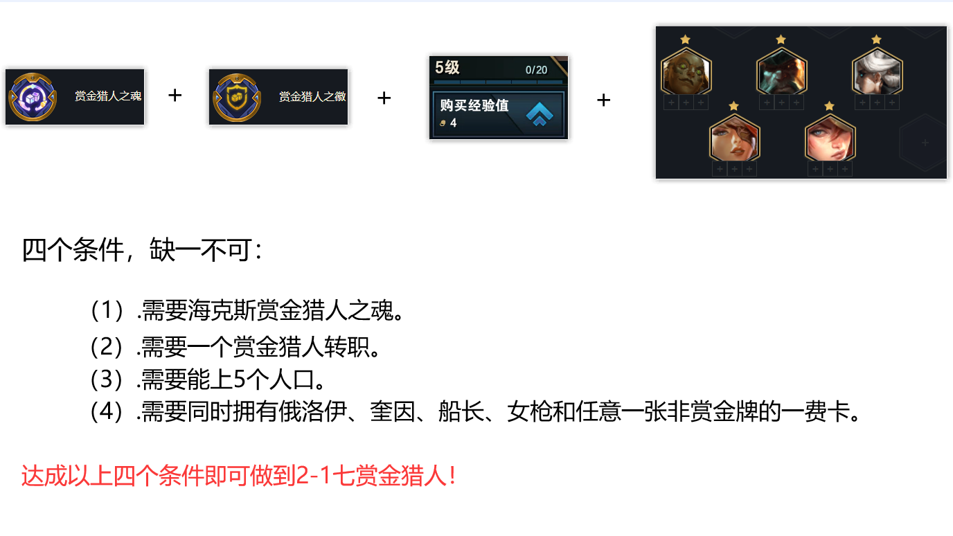 哈喽,大家好!我是臭皮匠,我记得在很久之前,我做一期关于“如何最快达成7赏金”的视频。当时得出的结论是单人模式最快2-2,双人模式最快2-1即可。可现在不一样了,现在单人模式也可以做到2-1七赏金了。具体该如何实现呢?如图所示:既然知道了条件,接下来我们就对这些条件的可行性进行分析。第一个条件好说,只要是彩色海克斯开局,并且我们 运气好拿到了赏金猎人之魂就行;触发这个条件的概率低于1%,大概需要