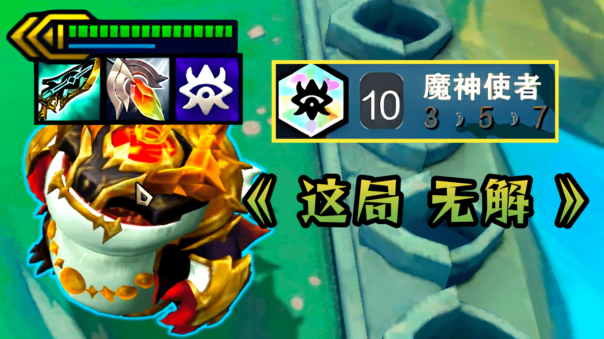 羁绊在视频里。我都点开了。一边3巨像一边7辛迪加。羊刀正义刮痧猫。哥们太有活了。但凡把阿卡丽卖了装备给猫咪都不至于被抬走。