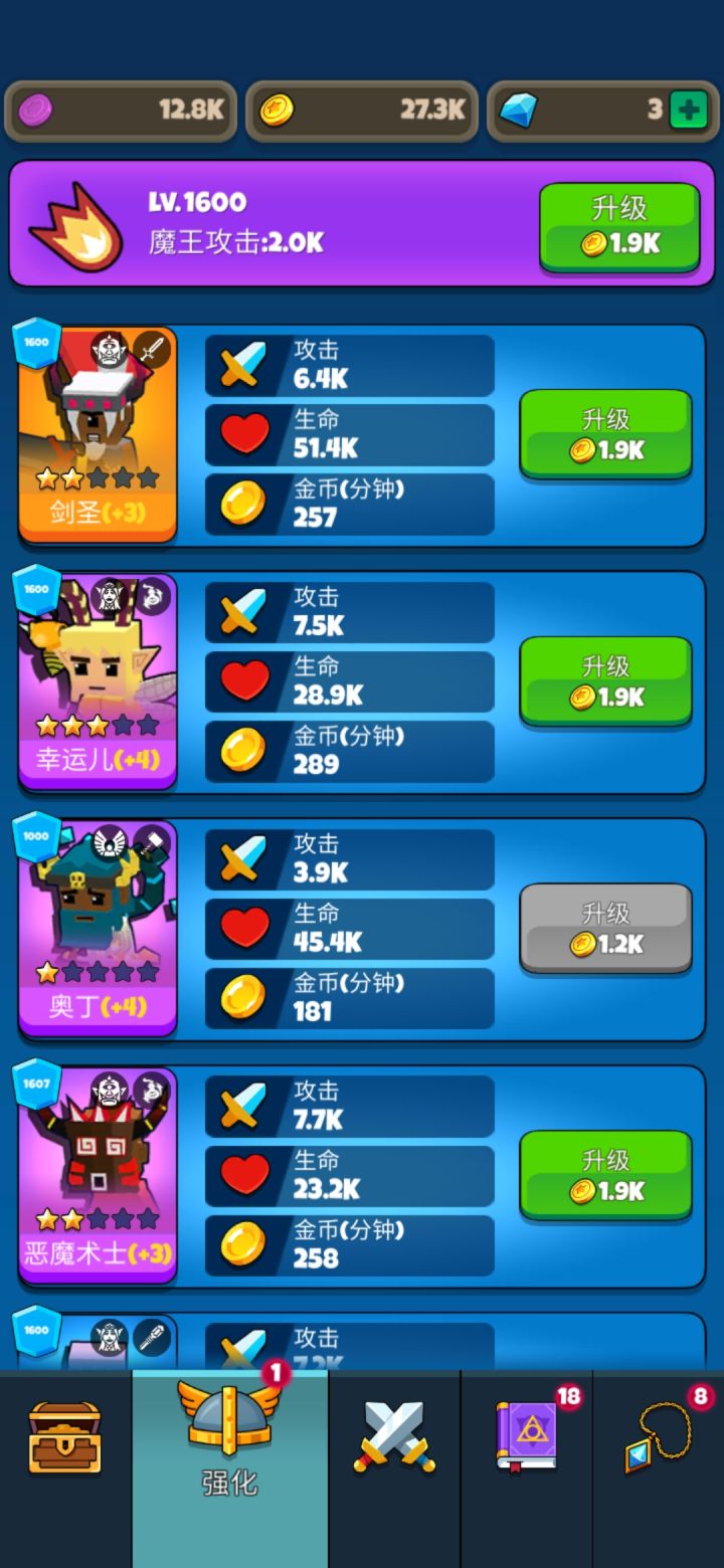 8. 羁绊功能,优先升级阵容就是为了凑羁绊位置(减伤很重要,1000级的狂战士,配上减伤50%,加上兽人羁绊的吸血。 我在400层打不过去,凑了50%减伤,狂战500层直接横着走,当时差点没吓一跳),剩下的羁绊看着你的阵容流派来就行,是4战士减伤,或者法师技能加伤,看着来吧,反正推荐至少要上2个战士,减伤25%