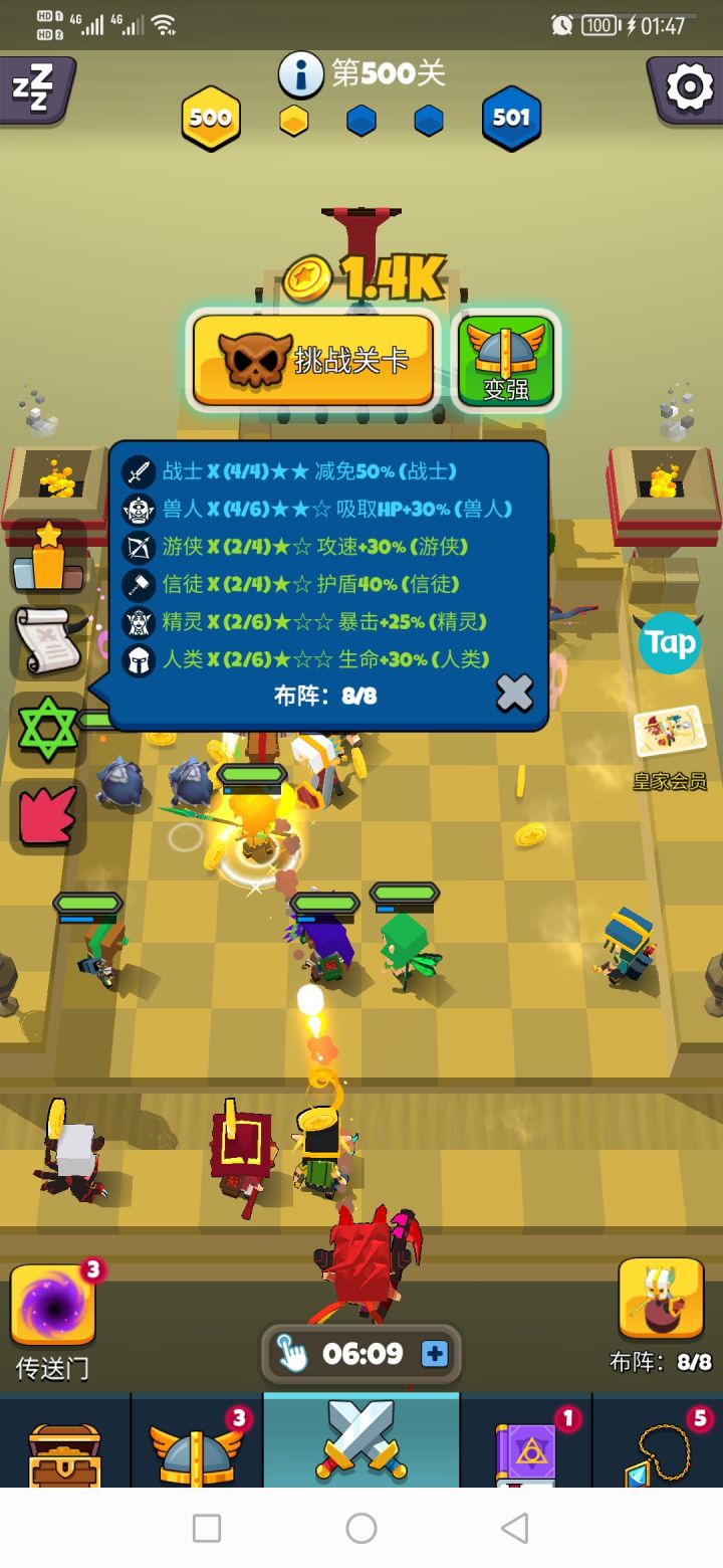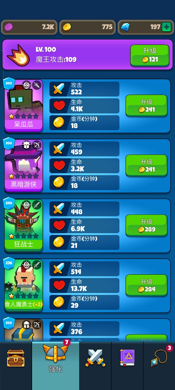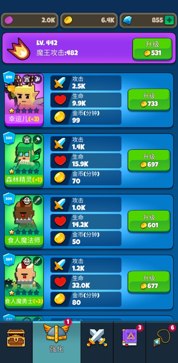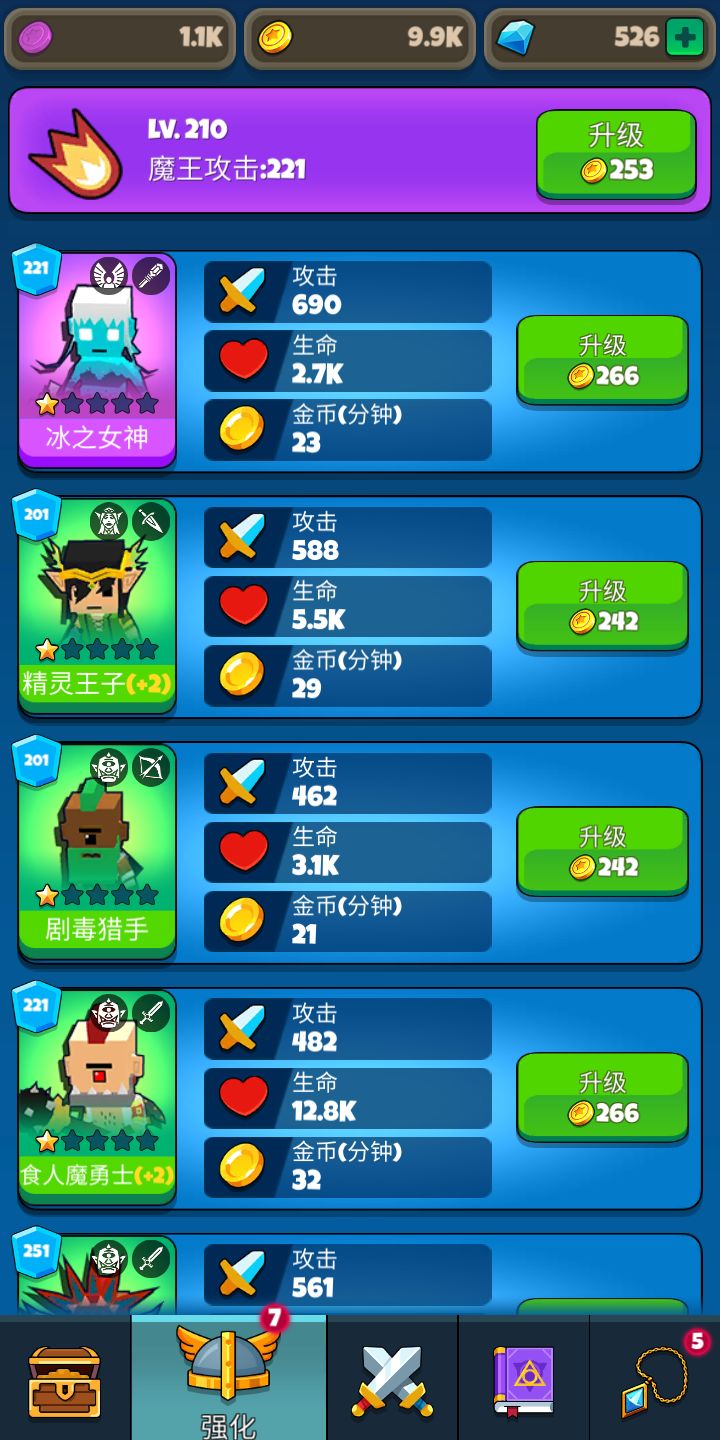 前期攻略,新手必看: 1. 刷开局: 刷出蛇发女妖(恶魔/射手)开局是最好,其次是狂战士(兽人/战士),狂战士开局仅次于蛇发女妖,(虽然狂战士是绿色品质的,但是必养), 刷开局方法是,进入游戏打过20层的龙,成就会给个100钻石品质的宝箱,战斗页面也会给一个龙宝箱,记得看视频,看视频的龙宝箱才是100钻石买的高品质宝箱,不看就是低品质木宝箱, 开完这两个宝箱之后,领完任务的钻石,刚好有到40的钻石,推荐再看3次20钻石的视频(因为这样比较快),凑到100,再买一个宝箱, 这三个宝箱刷出英雄概率更大, 如果三个宝箱都不出蛇女或者狂战士,直接去手机设置里找到游戏应用,删除数据,再进入游戏开启新游戏(会从第一层开始打),以上过程包括看视频的,5~6分钟左右 2. 快速刷金币: 有蛇女的在线刷金币比没有蛇女的起码快3倍,因为它是群攻,而且还是远程。 有蛇女的情况刷金币就是,只放射手,而且放最前的第一排,(2个射手加成30%攻速,4个射手加成60%攻速),蛇女搭配攻速加成,效率更高。 没有蛇女的刷金币就比较慢,不代表不能刷,方法是所有英雄放前面第一排, 有远程的就放远程, 因为非远程英雄打怪的时候要走动, 向前走的时候需要时间, 小怪都清完之后, 非远程英雄还要跑回自己站位的位置,才会刷新下一波怪。 注: 刷金币的英雄要保证每个英雄都有一击就能拍死小怪的攻击,这样刷金币效率才是最高。 3. 英雄升星: 升星主要是提升英雄等级上限,1星等级上限最高1000级,2星就是2000,以此类推。 升星的话需要荣誉点, 荣誉点通过竞技场积分第二天结算, 低于1000积分的,推荐都要花100钻石买次数(100钻石加5次机会), 有荣誉点就买狂战士的升星经验(不管有没有蛇女,都优先升级狂战士,现在可以看出狂战士的重要性了吧,如果没有狂战士,可以先存200荣誉点,等有狂战士了再买,1星升2星需要200荣誉点) 4. 神器功能: 神器功能的话开启到第三个神器就行了,第三个神器是阵容,开太多神器又花费钻石,又没有那个魔力币来升级神器,所以前期开太多没用。(神器推荐升级顺序: 阵容、攻速、吸血、闪避,一个一个升满,剩下的都随意升级,主要就是这四个) 5. 爬楼层,楼层越高每个小怪的金币收益越高, 以我3天爬600层的经验来看, 前期魔王是要升级的,即使金币很稀缺,你如果要打BOSS,那就必须升级魔王, 除非你狂战士等级很高, 不然不够BOSS锤的, 前期狂战士,几下就被BOSS捶死了, 有一点就是英雄死完了,魔王还能手动攻击,有那个倒计时, 魔王攻击上去了, 能和那个倒计时追赶,在倒计时结束前打死BOSS(魔王的等级我推荐的是,根据当前楼层的多少高上50级,有金币的话也可以高到100级, 比如当前楼层是100层,高50就是150级魔王等级,这个意思,魔王攻击到500的时候封顶,别升了,因为400层往后,BOSS血量跟女朋友的脸色一样,说变就变,变化还很大,加上升级魔王要金币很多,所以500攻击的魔王就封顶了,没必要升了,还不如去升级其他英雄等级来得划算) 6.肉山: 300层解锁肉山副本, 这玩意儿前期完全打不过, 所以前期不用在意, 但是推荐爬楼层爬到1001关就卡在那,就是1001关的时候,就全员阵亡,卡在那里,因为楼层越高肉山越难打,得在1001关的时候卡在那刷金币升级阵容英雄,为什么不在300层刚开副本的时候就卡, 因为300层小怪金币收益很低,你卡在那里金币收益那么低, 怎么升级英雄,所以推荐1001,金币收益也很大,比较合适卡的楼层(肉山副本奖励: 相当于买5次100钻石宝箱,材料徽章啥的就很多。) 7. 时光倒流功能, 时光倒流是魔力币的主要来源, 别花200钻石买魔力币宝箱,不划算,还不如拿去抽宝箱拿徽章,还会有概率出英雄,魔力币宝箱性价比就很低。 8. 羁绊功能,优先升级阵容就是为了凑羁绊位置(减伤很重要,1000级的狂战士,配上减伤50%,加上兽人羁绊的吸血。 我在400层打不过去,凑了50%减伤,狂战500层直接横着走,当时差点没吓一跳),剩下的羁绊看着你的阵容流派来就行,是4战士减伤,或者法师技能加伤,看着来吧,反正推荐至少要上2个战士,减伤25%