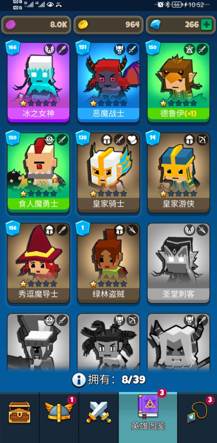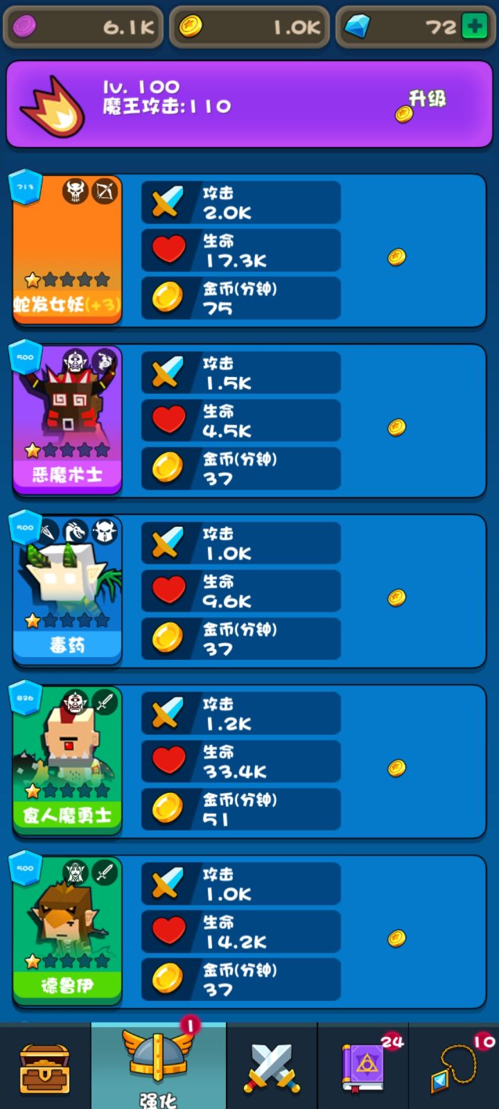 萌新入坑一天,感官良好,先说感官,不肝不氪非常舒服,想多刷东西就看几个广告,不想看就多挂机慢慢等,非常休闲,非常养老!深得我心!入坑前在TapTap看了几个前期攻略贴,不得不说老玩家们真细啊。也是浅刷了一下开局,但是想到自己的非酋体质,还是没强求蛇女开局,刷到个冰之女神就收手了。忙碌了一天的小萌新也终于在推到250层以后推不动了,感觉前期魔王等级还是挺重要的,后面硬冲的BOSS基本都是靠手K狂