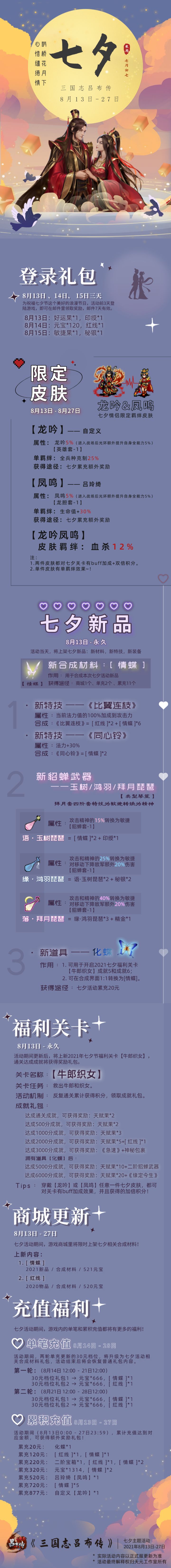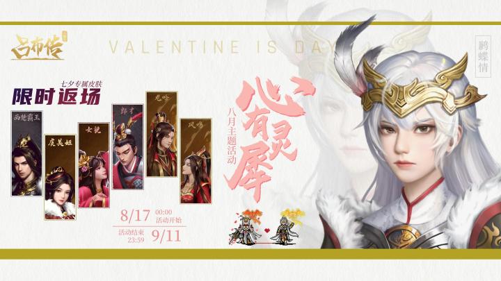 👑亲爱的将军大人们:“昨夜星辰昨夜风,画楼西畔桂堂东。”“身无彩凤双飞翼,心有灵犀一点通。”心无旁鹜,鹊桥能把相思渡。两情相悦,银河只把情意传。美好美景美愿意相逢,甜蜜乞巧节日即将到来,三吕准备了不少浪漫惊喜💗等你来开启,请仔细阅读活动内容,收获满满的福利祝福呦~《三国志吕布传》祝您与佳人共度浪漫七夕~【活动将于8月17日正式开启!!!】💗【心有灵犀 · 活动一览】 1. 登录礼