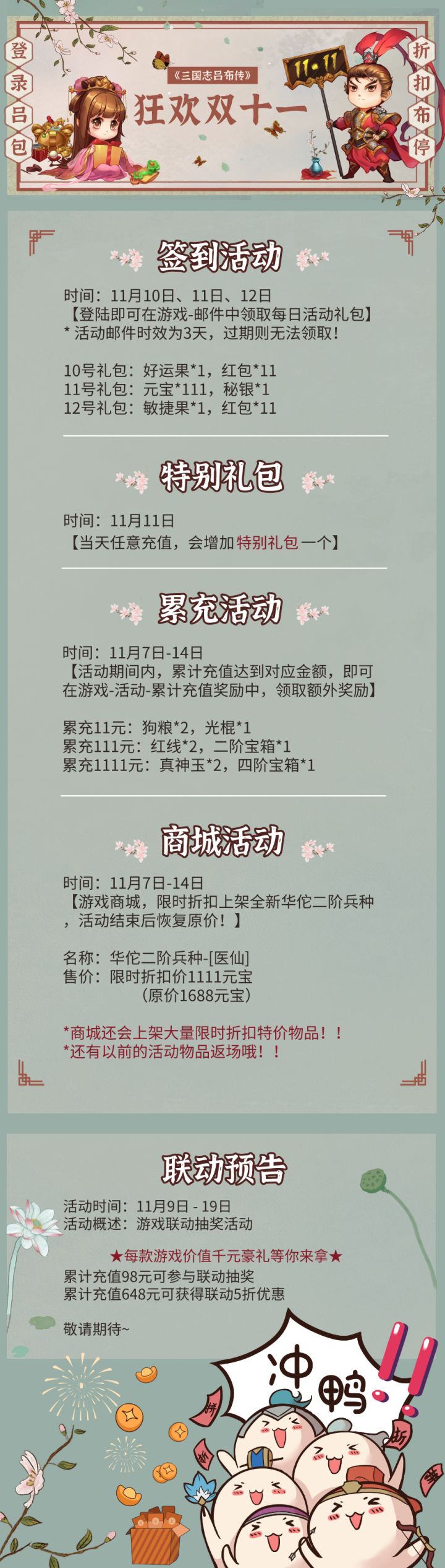 亲爱的玩家朋友们:双11即将来临,各种剁手套路接踵而来,玩家大大们一定看腻了,所以策划小哥哥机灵一动,连夜肝出了双11福利活动哈哈~小哥哥表示《三国志吕布传》不玩套路,只准备了真正的福利,同玩家大大们共度双11狂欢。 (活动图)画戟横推万马危,纵横乱世战一回。愿众玩家大大在《三国志吕布传》中醒掌天下权,醉卧美人膝,共扫汉末烽烟,共度双十一狂欢。