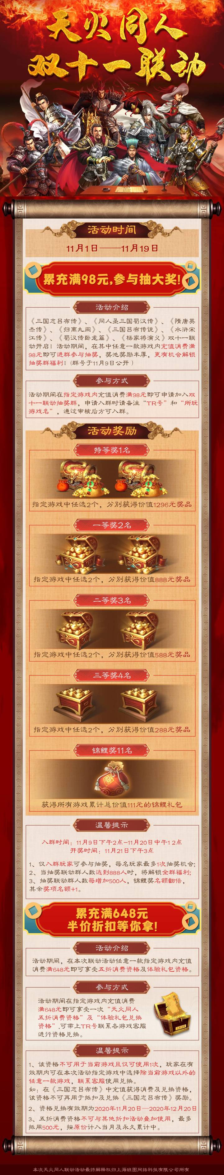 亲爱的玩家大大们:天火同人(之同人游戏),以弘扬华夏历史、传承华夏文明为信念,值此双十一狂欢之际,天火同人亦为玩家大大们准备了一场互动狂欢,本次活动涉参与产品数见下图展示,快来给你喜欢的游戏疯狂打call吧!无论你钟意的朝代是三国、还是隋唐、或是两宋;无论你喜欢的英雄是刘备、还是宋江、或是离柔;一场汇聚各个时空的狂欢已然开启!【官方QQ群:1062061775,欢迎来讨论交流~】小编在此恭候
