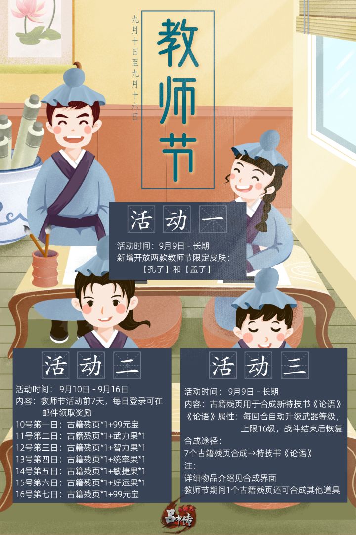亲爱的吕朋友们:大家好!一年一度,春风秋雨,我们即将迎来2020年的教师节。9月10日,这个原本在日历上平凡普通的日子却因为有了教师的伟大,而变得更加不同凡响。在此感恩每一位为教育事业贡献的教师。说起教师,不得不提历史上首位“人民教师”——孔子。孔子其人,有教无类,开平民教育之先河。当然,我们忘不了课堂上的恩师,亦忘不了游戏中的引路人。在《三国志吕布传》中,亦有无数名师,所谓“闻道有先后