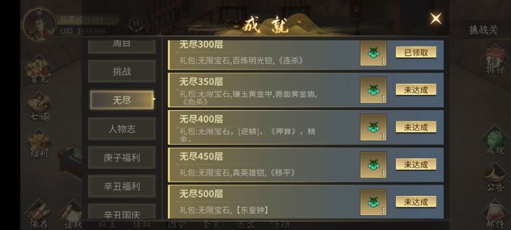 7个神器,1000天赋果,剧情2周目,无尽700层。打到第29回合才拿到成就。