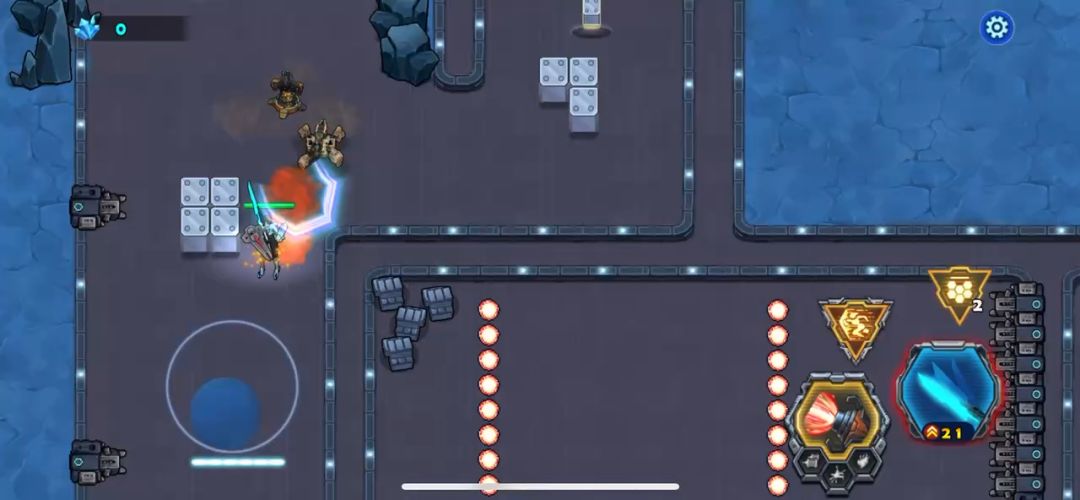 开局攻击红色弹药引发爆炸炸开围栏,围栏的开启正式进入虐战,面对无法打爆的机关快速通过是唯一的选择,激光射线矩阵也是一样操作,打爆控制台第二道围栏开启后敌人小BOSS出现很不好打,难得还在后面,通过后来到九宫格,上排492,中排357,下排816。合力击败出现的圆球机器后就决战此关BOSS轨道铁甲列车了。没有强化的玩家建议不要去尝试~比较难!