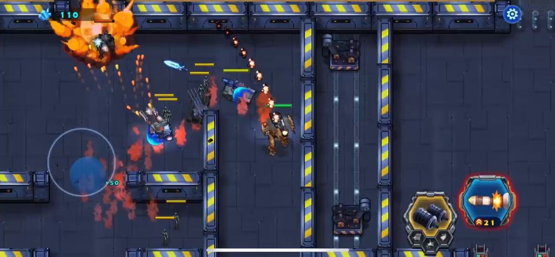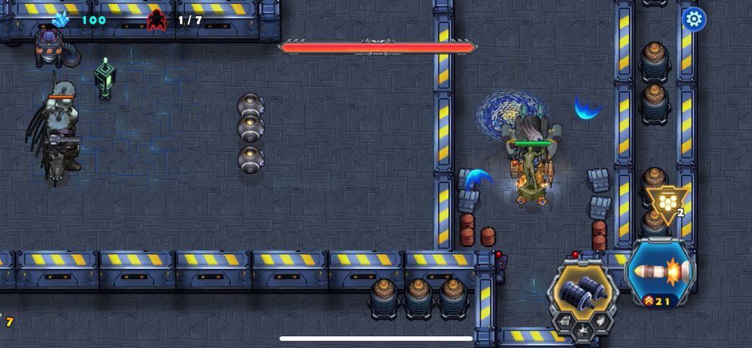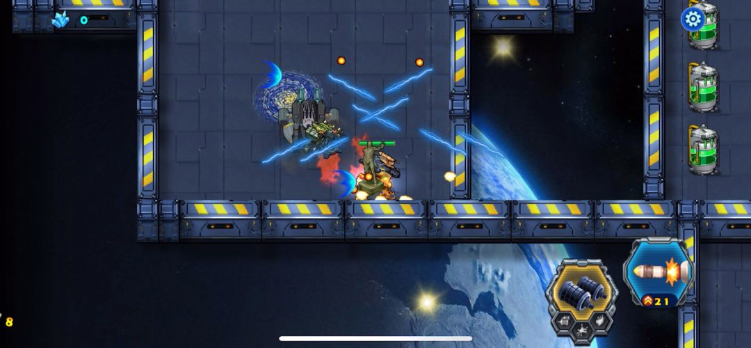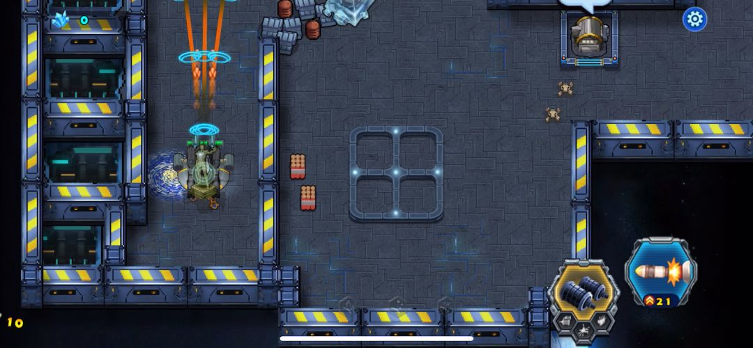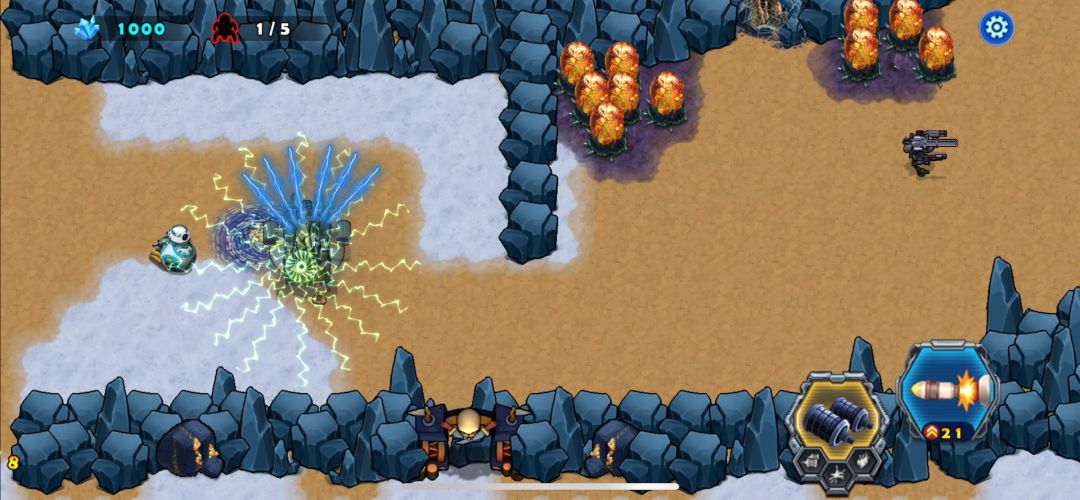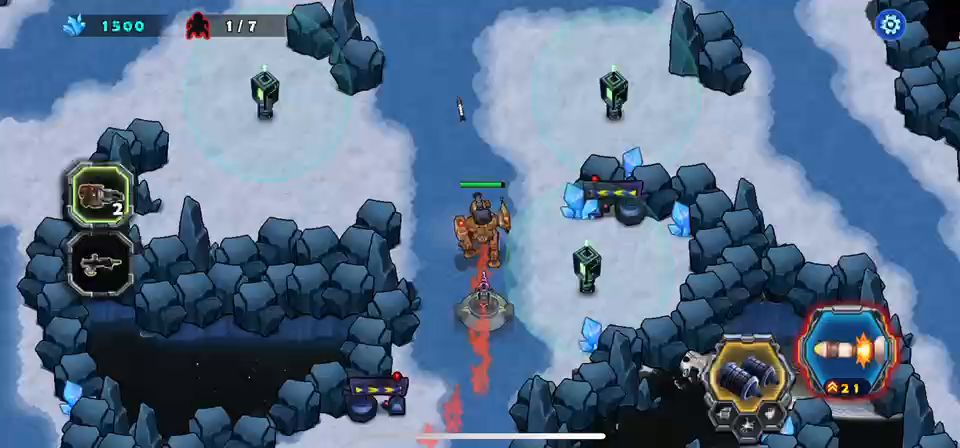 弧反应堆的第一关进来后看到是保护建筑的防御局。能放置枪塔的地方很多,说明这局不好打。特别是敌人第一波的进攻就是小恐龙,后面的敌人等级不会低于这个,果不其然第三局就有硬货出现了。机器铁牛,飞行球等陆续上来了。这些敌人防御很高,而且是两路进攻,放置的枪塔根本挡不住敌人,战车要快速清理一路马上增援另一路才能保证建筑的安全。就这样挡住6轮进攻后敌人大佬出现,感觉很难打而且攻击发射的子弹都是成片的,费劲打死