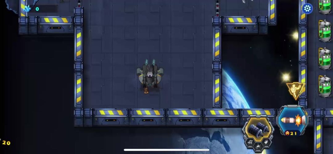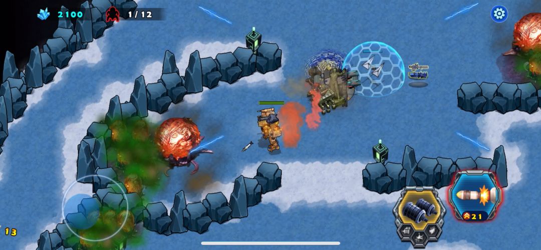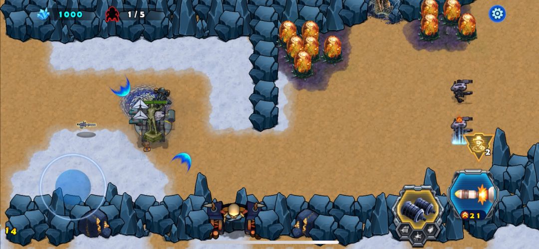 这一局挺难打的,难点就是地图上面和左边的机关处。单纯的机关努努力还是能通过的,但是除了机关还有敌人的塔防驻守,上空还有飞碟投掷的燃烧弹,一不小心就掉血,战车掉血就是一连串的打击瞬间暴毙,有铁人像的就好过了,刷处无敌防护罩。在必要的时候开启快速通过机关过道迎战大蛇,打掉即可通关。