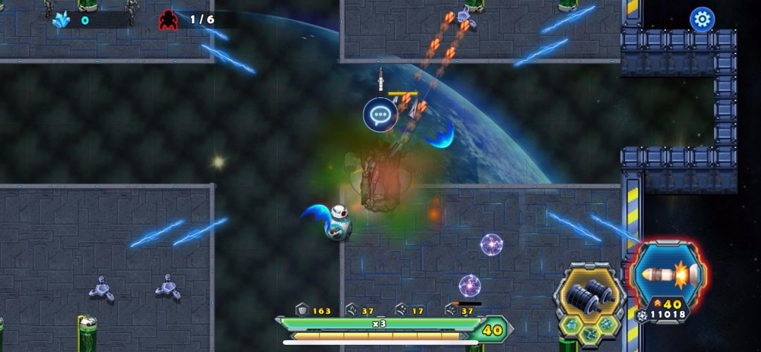 营救eve的第一关,竟然有剧情和对话的第一关,大体知道战车要在理想号飞船上营救伊芙,这关就是小试锋芒的一关,开局就快跑在机关启动前驶出机关危险区域,就只碰到的几座大炮台,战车所过之处自动锁定就能打垮它们,尽头是巨型炮台,它的射速很慢而且血量很少,只要投掷的双雷砸到它,几下就可以解决这个驻关Boss。