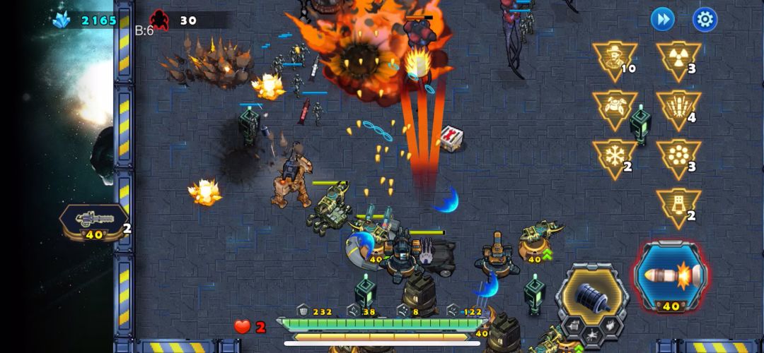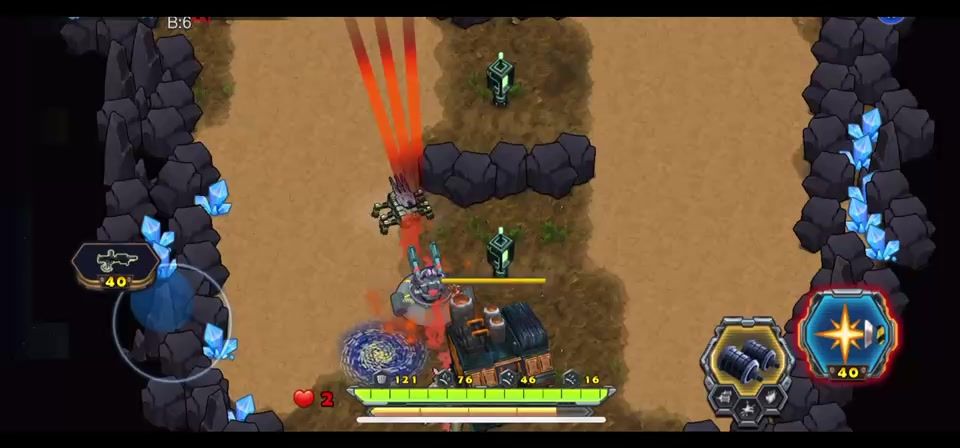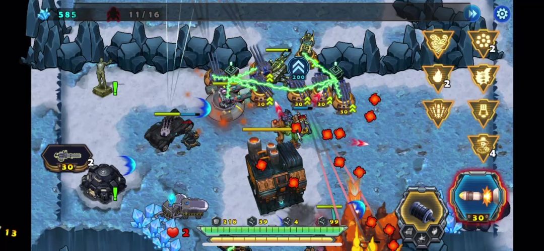 敌人四面进攻官方在这一张图内还会送很多塔防枪塔辅助我们防守。升级后的效果很明显,敌人根本接近不了基地,主站车用的是喷火枪。对付刚开始的那轮虫潮进攻很有效。连枪塔都来不及放置,还好随着辅助塔防的不断完善升级,使敌人后期没有什么有效的进攻,平稳闯关