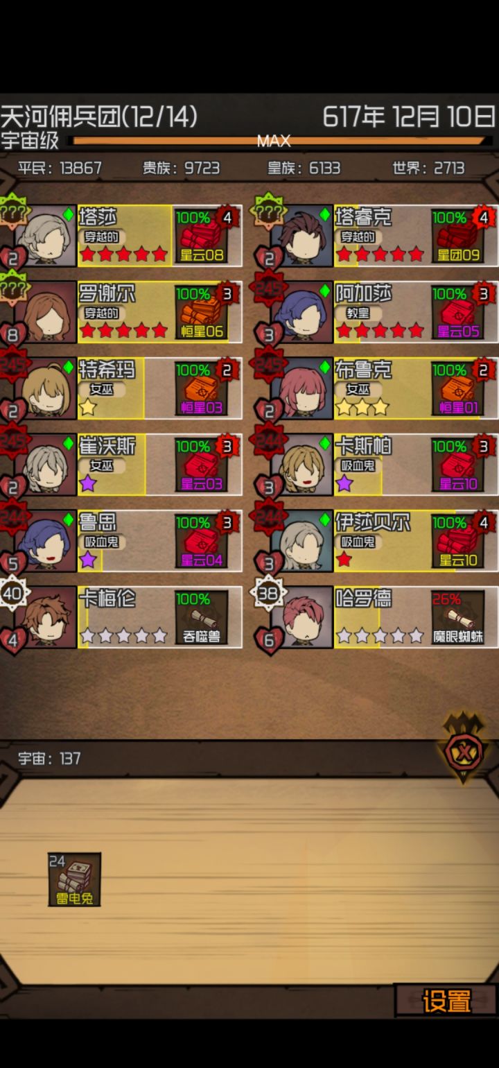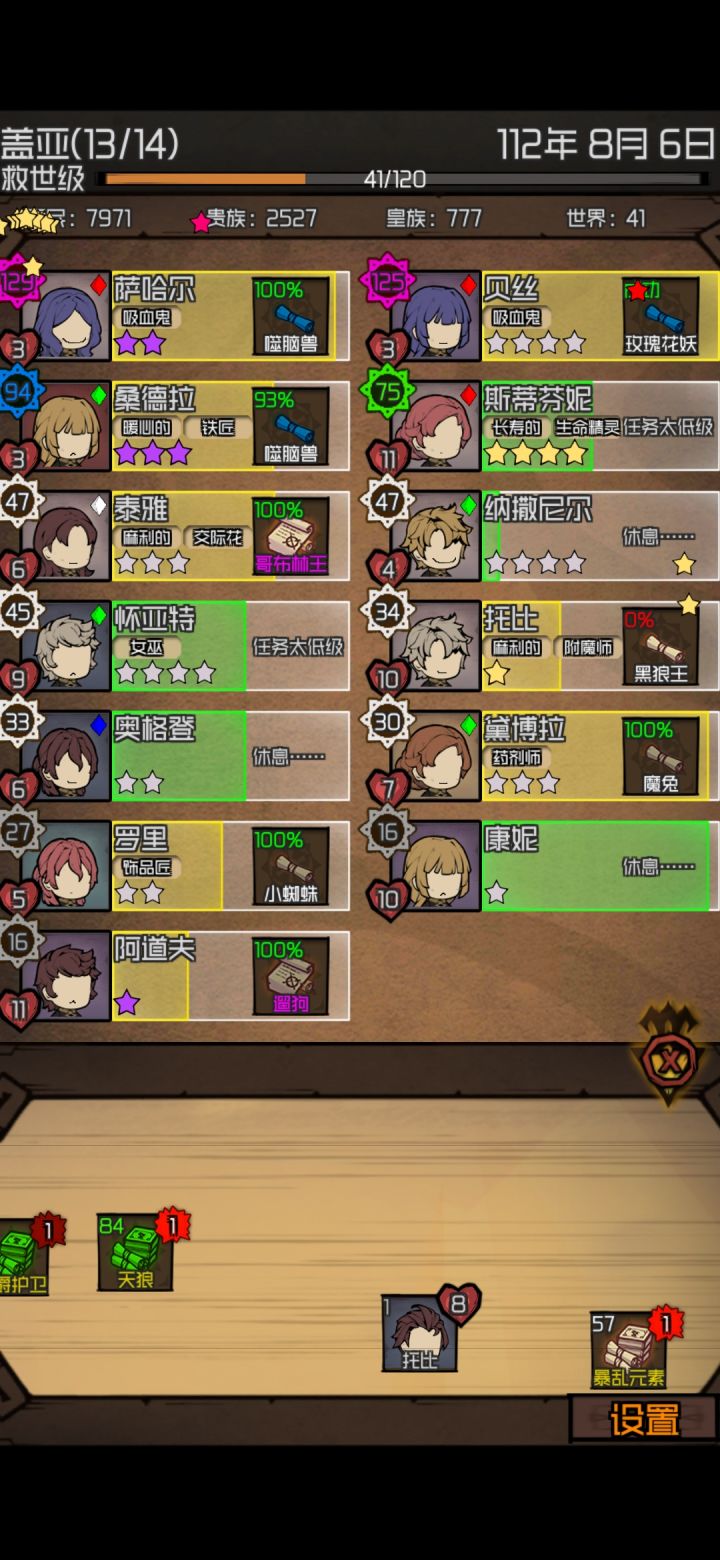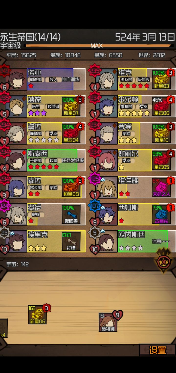 核心:吸血鬼+女巫+灵族吸血鬼可以吸普通人族的血,保证不会老死。灵族产出泪滴了提升资质,用来培养吸血鬼星级,平均3-5个提升一星,星级影响等级,星级不够,到一定等级就会卡住难以提升等级。目前应该是上限为红色5星吧,我提升到红5星,用了十多个都没提升。女巫产出血药,用来恢复灵族与女巫的血量具体操作:前期随缘,尽量提升一个星级最高的佣兵,下方点击板中的任务尽可能去替换自动刷新的任务,给的经验