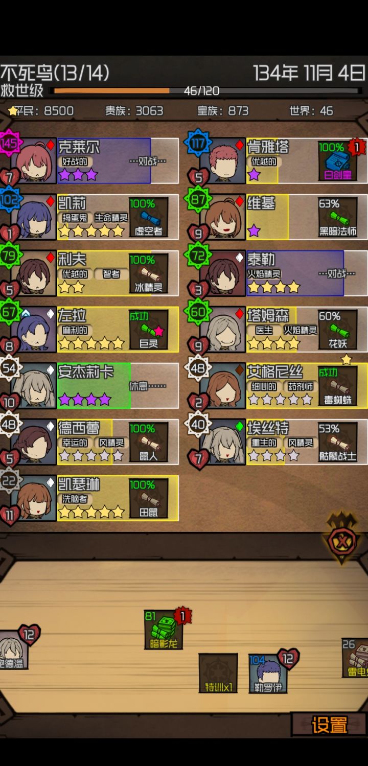 这游戏想要简单通关就得吸血鬼,大体配置N吸血鬼,3女巫,1教皇,2或1灵族(后期可以舍弃),一个皇室。大体流程1开局送的吸血鬼一直刷,其他人物不管2碰到女巫有多少要多少,产出的血药给女王女巫自己吃,直到出现教皇,灵族或者皇室后以女巫住,教皇辅,其他不死就行分配3教皇刷出来了(脸黑教官也行,再脸黑就直接纯吸血鬼吧)就训练全给教皇全力怼保证教皇等级压制4灵族一个就够 ,产出的珠子全给教皇刷到5红
