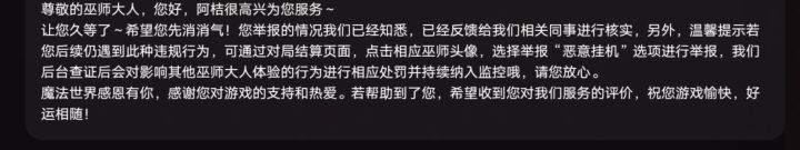 打了这么久,发现,决斗的举报系统就是个摆设。队友挂机故意送的,根本就举报不成功。竞技游戏不能举报想想都好笑。别跟我说有啥举报键,开服到现在举报的从来都是那几句客套话,一点惩罚都没,人家举报系统就设在结算面,你游举个报能费劲死。看你这竞技能活多久,气人。补充:结算页面一晃而过,然后点巫师头像,然后点举报写理由,一肚子气累死累活就换来你这么敷衍的几局话?