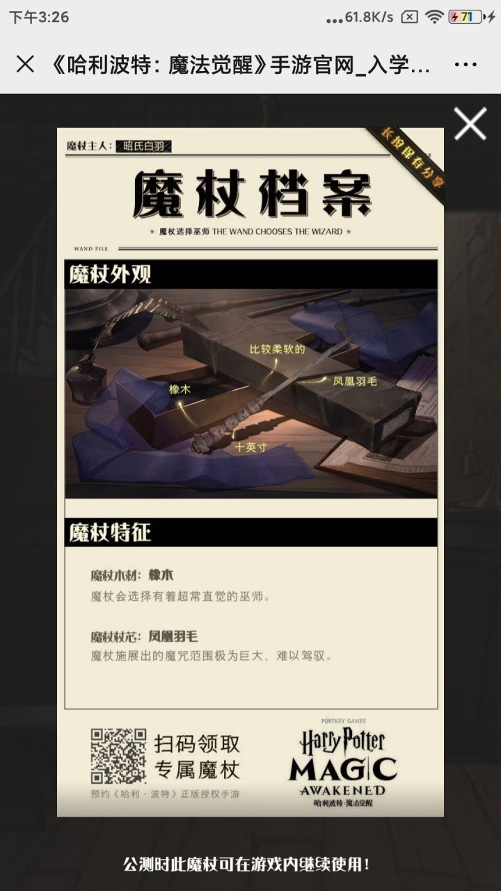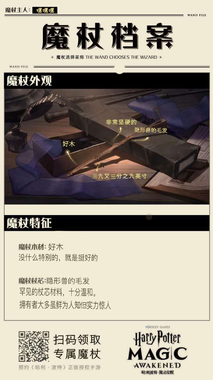 请求官方大大考虑一下,随机也。。。。。。行吧就是差的太多了官网做完题目是:红杉木,凤凰羽毛,14又二分之一,富有弹性然后预约就变成了:桃花木,龙的神经,12又四分之一,非常坚硬虽然说是说魔杖选择主人可是。。。。。这差的也太多了吧,毕竟也是一本正经翻译了测出来的,现在进游戏就被这么随机一抽有点。。。。。。emmmmmmmm