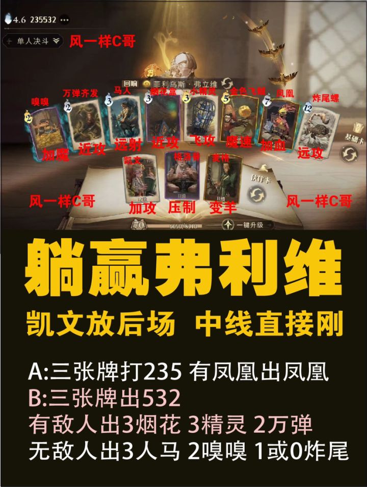 躺赢弗利维卡组来了传奇轻松8连胜,能上7000分。❤开局后场放凯文,直接中场刚❤ 235有凤凰打凤凰,没有直接打飞贼❤532旁边有敌人3费出烟花或者3精灵,2费出万弹齐发。无敌人出3费人马2嗅嗅或者1 0炸尾螺然后就无脑躺赢了,赶紧学习吧,晚点出视频。#哈利波特魔法觉醒#