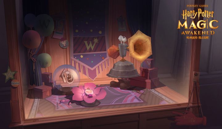 【橱窗中摆放着礼盒,这一次他们又准备了什么样的惊喜?】店牌上的巨型人偶笑容可掬,向好奇的行人脱帽致意;绚丽的烟火在展柜间跳动飞舞,琳琅满目的恶作剧商品塞满了整个店铺。来自韦斯莱把戏坊的惊喜即将送出!本期角色回响物件赏析将为大家介绍韦斯莱家的双胞胎,弗雷德和乔治的角色藏品。还记得这些稀奇古怪的物件,为我们带来的欢声笑语吗?盛放在心形玻璃瓶里的粉色药剂,会引起饮用者强烈的迷恋。六年级时,罗恩在