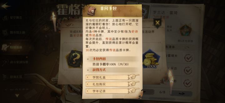 有人比我非吗,图书馆保底两次了,学院宝箱没出过金,拼图活动给的画像还是蓝色,目前苟到禁林10星还不给金回响,爆率还不如七星八星,开服到现在的非凡卡包成功给我开到了29个,太离谱了😓😓😓