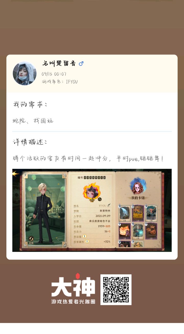 不是舍友,单纯好友,求舞会5星sss玩家,2v2高技巧玩家,魁地奇百分玩家,占卜课、魔法史、保护神奇动物、黑魔法防御课打完美级别玩家,或者肝帝,氪佬本人一服鹰女,内测全卡,禁林8级