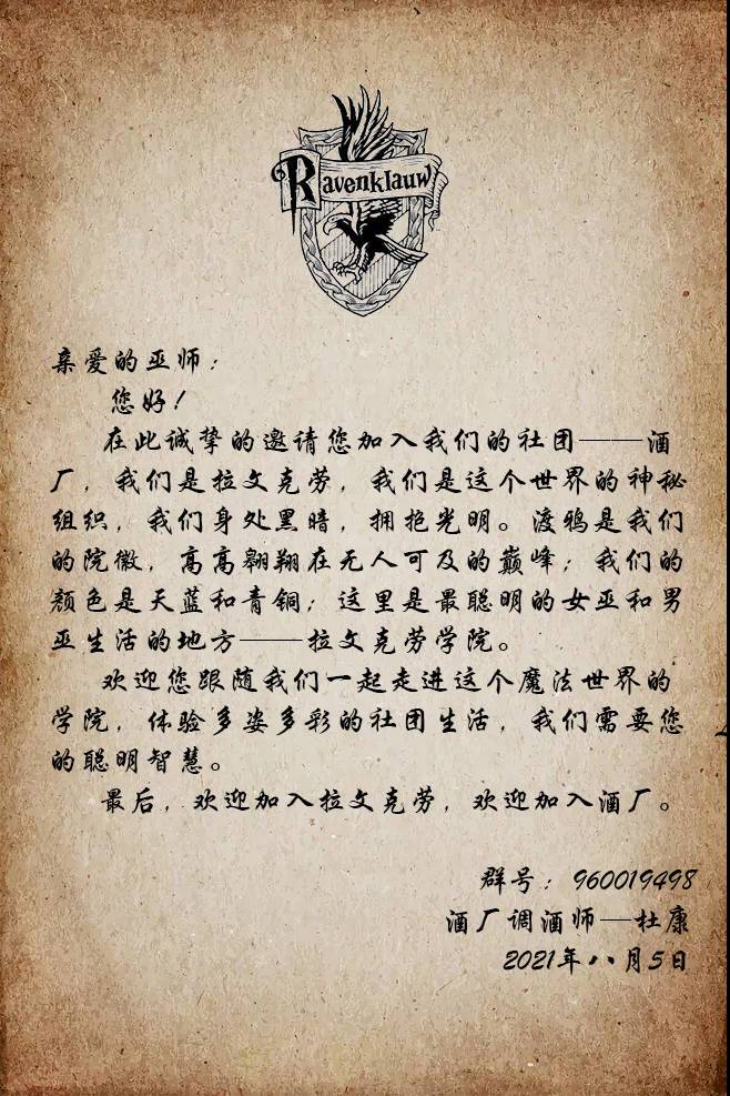 社团名称:酒厂所属学院:拉文克劳(鹰院)社团简介:我们是号称世界上最神秘的犯罪集团-酒厂,可以给小鹰们提供良好的教育。 这里有FBI的情报网,我们的成员都有着很高的搜查情报能力和观察能力,还有鹰院的帅哥美女,你还在等什么(゚o゚;快来加入吧!简介2:我们是酒厂,一个神秘组织,长期活跃于江户川柯南的身边,我们将于九月入住拉文克劳学院,在这个魔法世界,展示我们的风采,入社的小鹰们可以免费喝黄油啤酒哦,以后霍格沃兹的酒业就是我们承包的了!注释:相中的小伙伴一定要来呦!