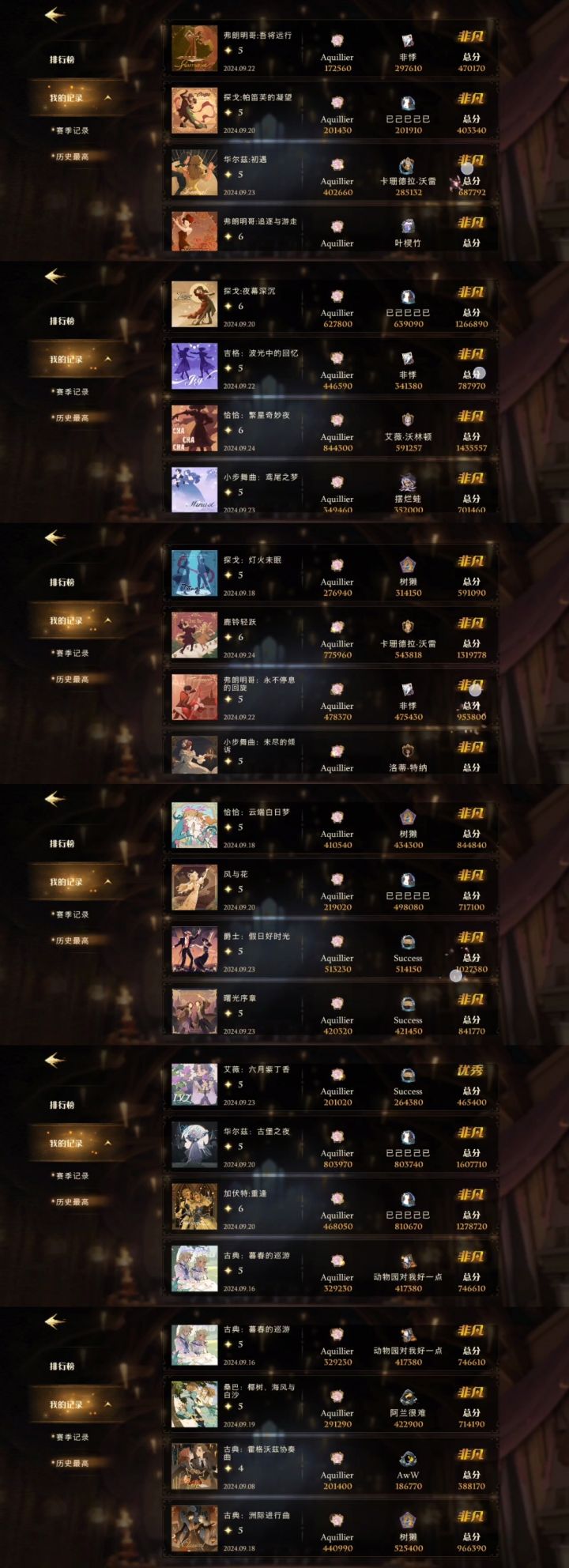 水平不是很稳,有些6星刚解锁还不是很熟练,初遇和艾薇不太熟,好像还有个古典霍格沃茨?我好像没有这个曲子不想再跟NPC跳了,哪怕全连也拿不到非凡