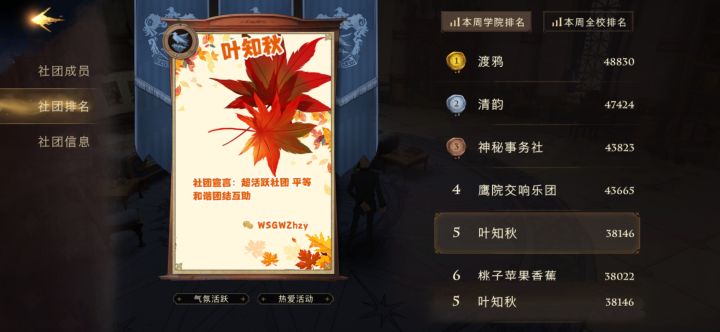 福利:每天活动八十人左右参加,可领60徽章,草药每次打满2400分以上,最快进社团8天就能换金卡。要求:招收活跃玩家,全勤玩家优先,欢迎每天愿意花十五分钟不摸鱼的玩家,有事可请假。无论萌新还是大佬,我们只看重是否积极活动,无关氪金和段位。其他:以平等团结和谐互助为宗旨,群气氛活跃,禁林协作交友都没有问题,还及时更新各类活动攻略和福利,是一个和谐大家庭。一叶知秋,落叶归根,希望能找到有归属感的长