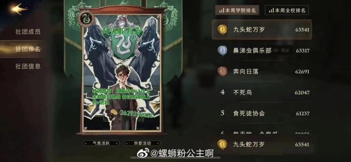 #哈利波特[超话]# #哈利波特魔法觉醒[超话]# 二服对角巷🐍🆔【九头蛇万岁】社团招人啦!长年久居蛇院前三,全校前十。每周草药和活动都开满。社团有好多漂亮妹妹也有很多大佬。社团有国服前五十大佬,也有要去打全国64强的大佬。经常有红5紫10发车,很多手记大佬可带禁林,还有大佬带你五星初遇全连上s奥,带你刷刷开五星曲目,协作也完全可以内部消化,再也不怕中途卡住!有vx群,群里面大家大家很活跃,偶尔会发大🧧,上次还有抽送盲盒。招活跃5⃣️0⃣️0⃣️,尽量全勤玩家, 有意者vx联系。
