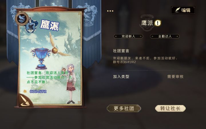 鹰院社团招点人——每周固定时间草药,每周参加几次社团活动就行没啥别的要求有答题大佬有舞蹈大佬有魁地奇大佬,也有氪金大佬和竞技场大佬不咋组织其他别的活动都是随缘参与呜呜来点新的活人吧好多人都不玩了我心痛😢