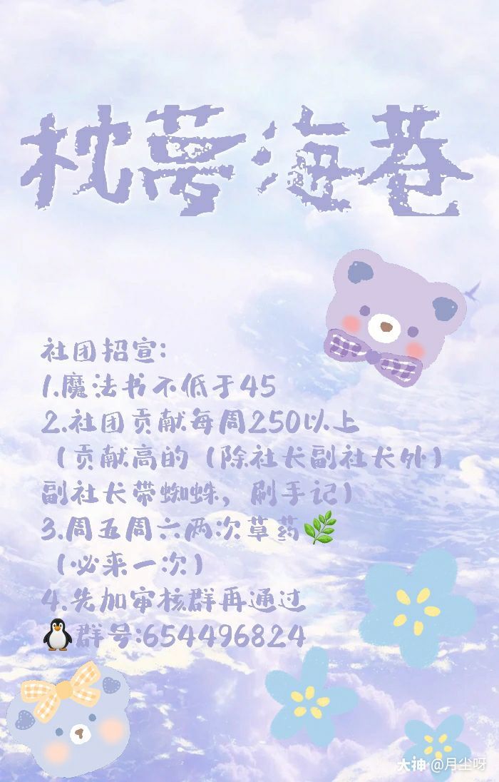 🦁 狮院的集美们快来康康呀!!!要求活跃,魔法书等级45以上,每周能做到周贡260以上就可!先加审核群哦~🐧 群号:654496824周一到周三答题🙌🏻(有社长带飞跟着选就好啦),周四到周六跳舞💃🏻,周日魁地奇 周五周六9点20开始草药活动🌿(必须参加一次)贡献度前五名可联系副社长带蜘蛛或者没刷完的手记真的真的真的不心动嘛?!🤔
