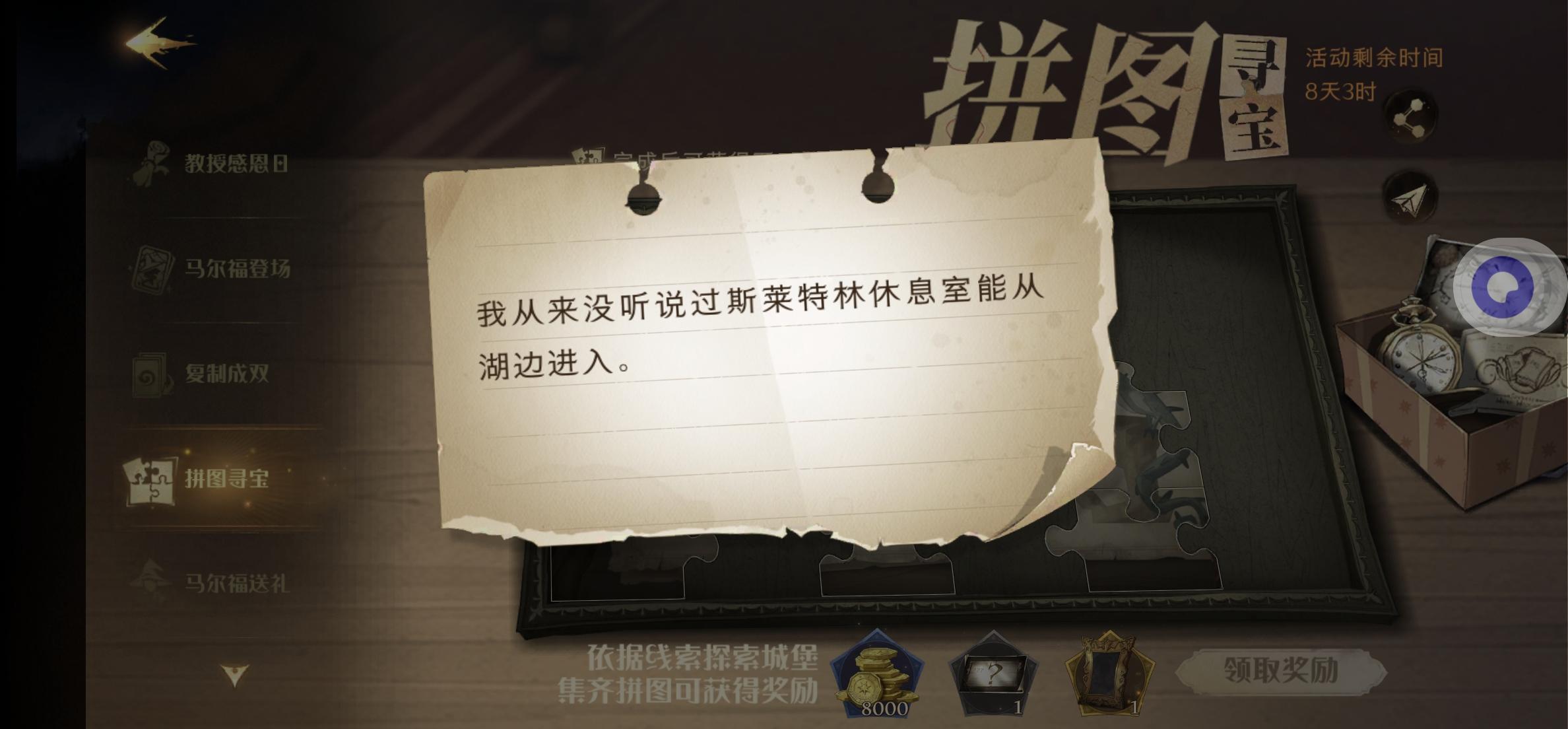 今日拼图1,禁林后面海格的小屋2,赫奇帕奇休息室旁边画像3,魁地奇球场内的金色飞贼(点他)