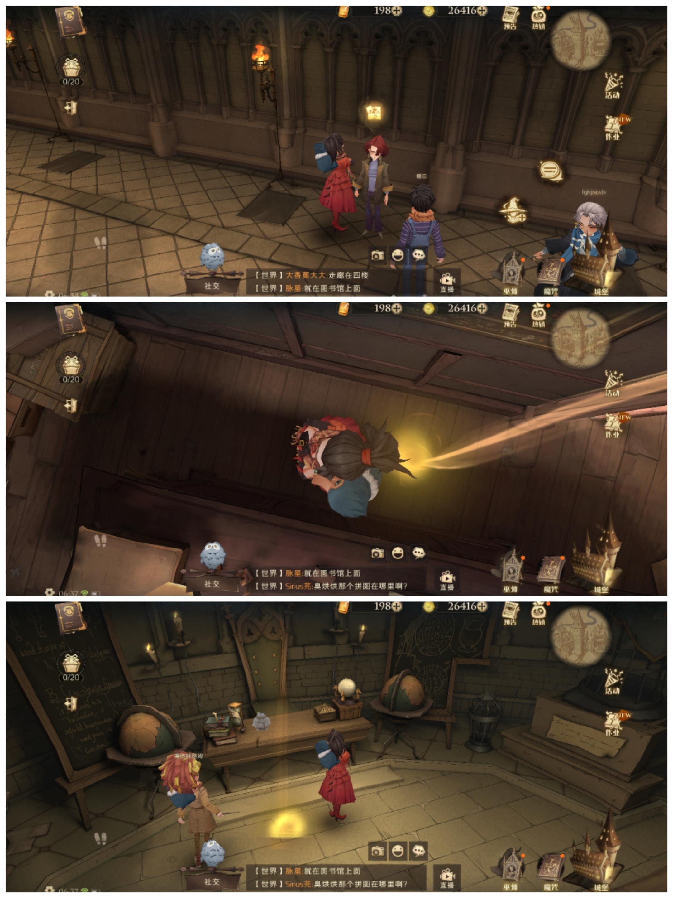 【湖边码头】城堡外湖边码头,找外侧卡珊德拉跳舞【城堡主楼】城堡内斯莱特林休息室往下的楼梯中间金光【校长室】使用隐形药水进入校长室,冥想盆与壁炉中间墙角(下附制作方法和神秘成就)1.城堡外码头2.城堡里斯莱特林寝室楼梯中间3.校长室隐身药水在寝室制作魔药,点获取,点课堂积分兑换小贴士:隐身之后记得把其他3个学院寝室逛逛,完成【夜游之神成就】